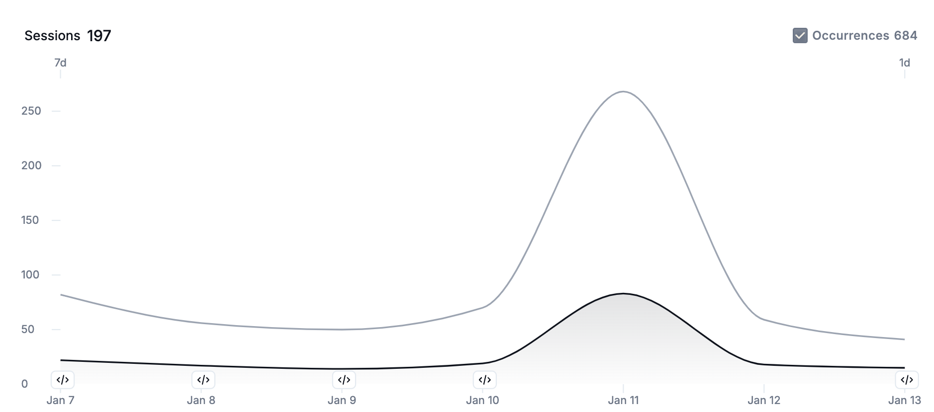 Review the Sessions and Occurrences charts on the Overview tab to verify that ARL and occurrences have tapered since the fix was implemented. Be sure to adjust the time period dropdown to pull data for an appropriate length of time.