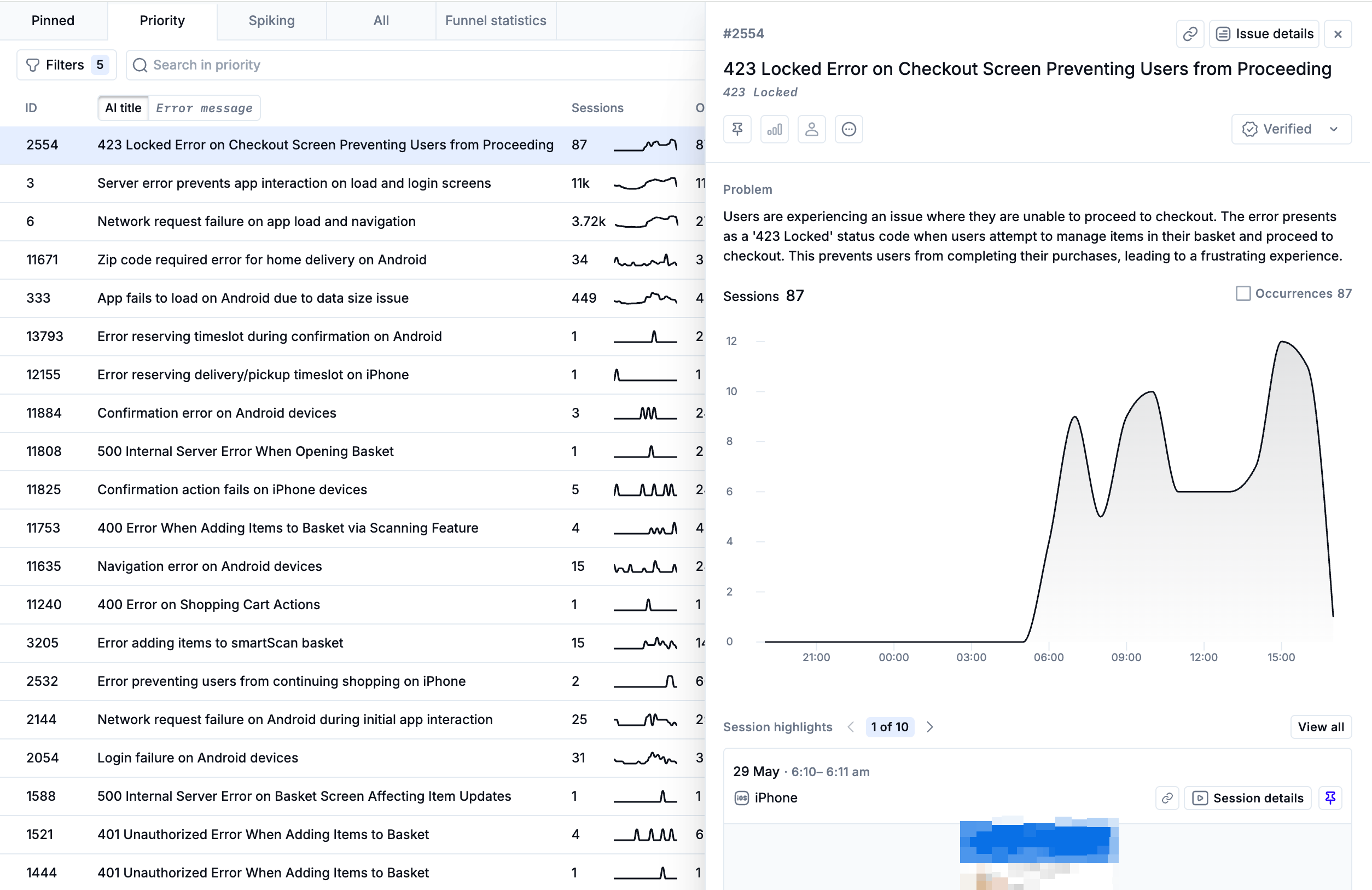 Clicking any issue in the table opens a side panel that displays a summary of the issue’s frequency, user impact, and associated session data. This allows for a quick initial assessment without navigating away from the main view. If more context is required, clicking the Issue Details button will bring up a full, in-depth view.