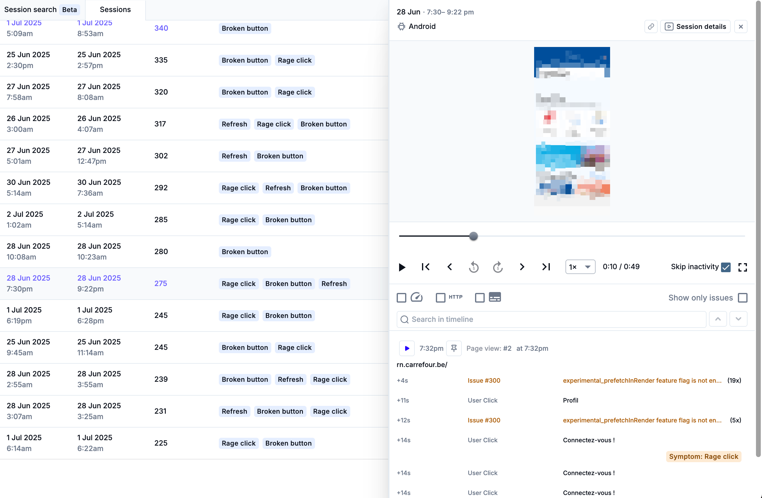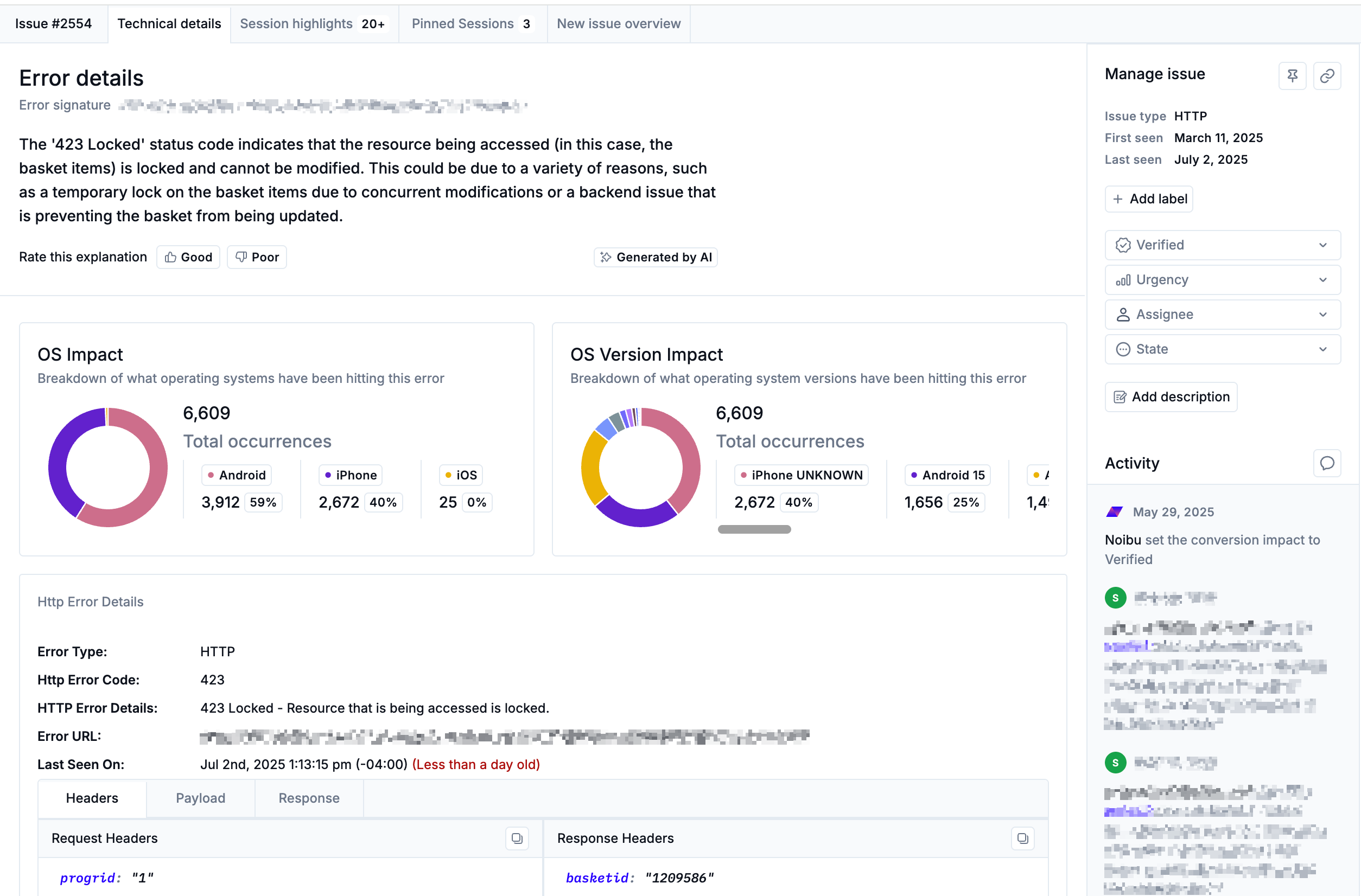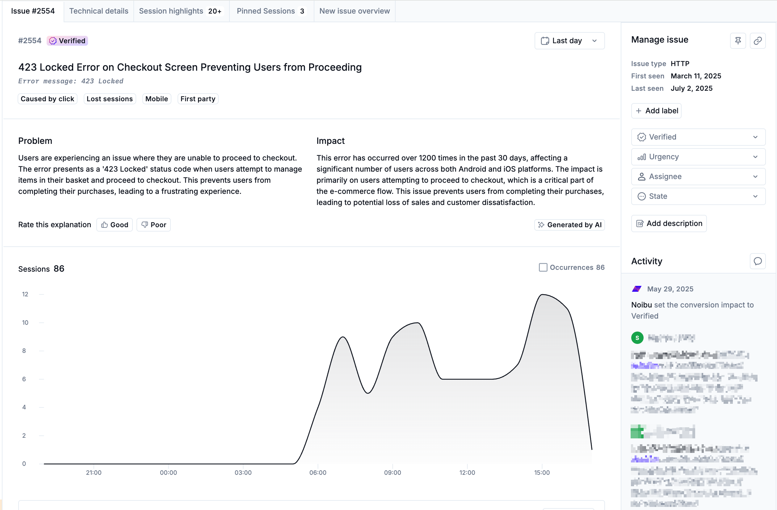 Pinning a session flags it as an important example of an issue’s impact on customers. This action ensures that the session is retained indefinitely and provides a convenient way to share context with developers or stakeholders. You’ll be prompted to associate it with a specific issue and describe its significance. Learn more about pinning sessions.