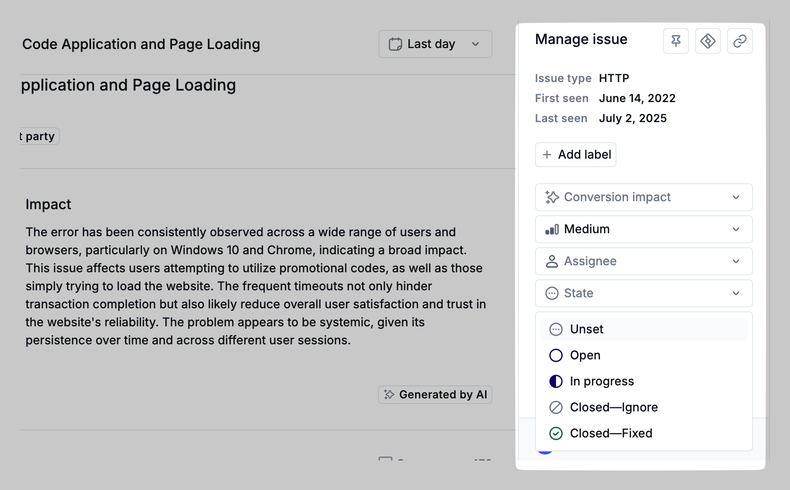 The Manage Issue panel on both the Issue Overview and Technical Details tabs makes it easy to triage and manage issues once they’ve been investigated.