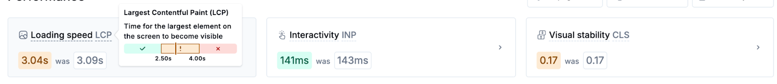 Our platform uses the 75th percentile (p75) of pageviews to measure Core Web Vitals, ensuring pages work well for the majority of users. For example, if 75% of pageviews meet the “Good” threshold (or better) for a given metric, the page is categorized as “good” for that metric. This follows the same industry standard measurement approach promoted by Google. Learn more about Core Web Vitals.