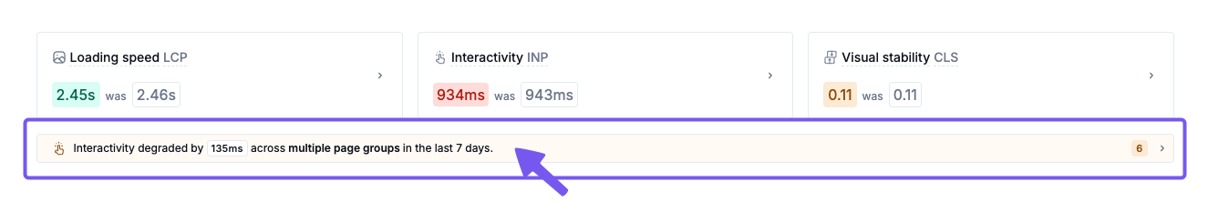 Under the three Core Web Vital cards, you’ll see any applicable warnings about degradations in your site's performance across different devices and page groups. Clicking on this warning will take you into the relevant detail page for that Core Web Vital for further investigation.