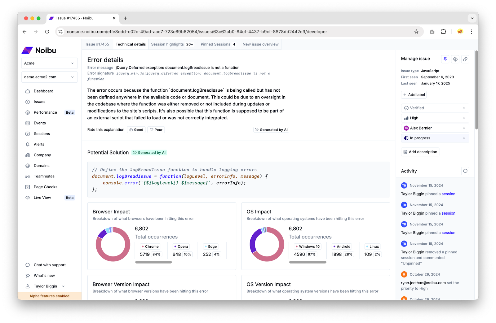 For JavaScript issues, an AI-generated solution to the problem will be generated, if available. If a JavaScript error has a stacktrace that clearly defines the problematic line of code, Noibu uses AI to generate a suggested code snippet to fix the issue. This can be a helpful starting point for teams to begin implementing a fix.