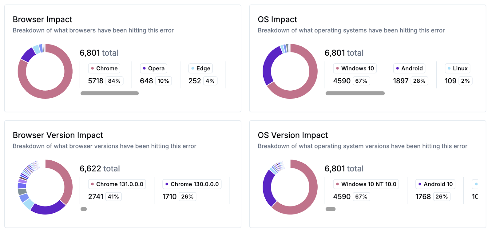 When analyzing these browser and OS charts, consider that the distribution of occurrences may be impacted by the market share of specific browsers and operating systems. For example,if the Browser Impact section indicates a majority of occurrences happen on Chrome, it's may be due to the market share of this browser, and not necessarily because Chrome is disproportionately affected by the issue.