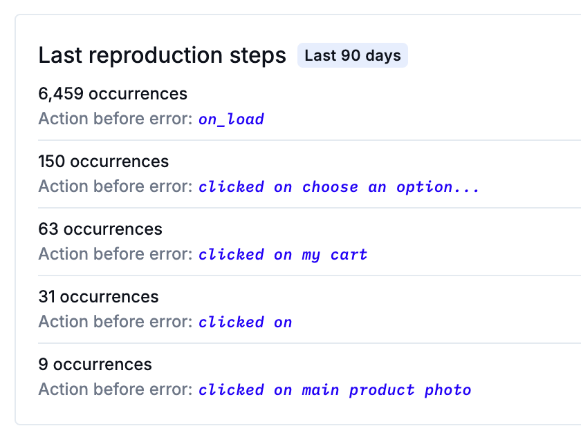 The Last Reproduction Steps section summarizes the most common steps a customer took immediately preceding an error. The same error may occur at multiple steps in the customer journey, but this section helps you identify the step or steps at which the error usually occurred. This could be a click, a text entry, or a backend process like a page load. Click on one of the reproduction steps to open a list of session recordings that showcase the error at that reproduction step. Learn more about Sessions.