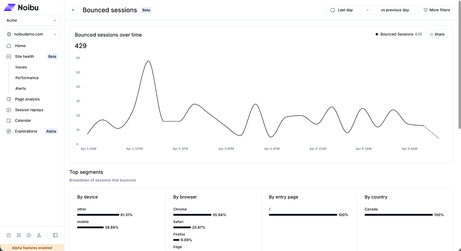 Bounce is most meaningful in context. A high bounce rate alongside stable Total Sessions may point to a campaign quality or landing page issue. Bounce that correlates with a spike in Front-End Errors or degraded Endpoint Health is more likely to have a technical cause. Use the Sessions page to investigate specific bounced sessions in depth.