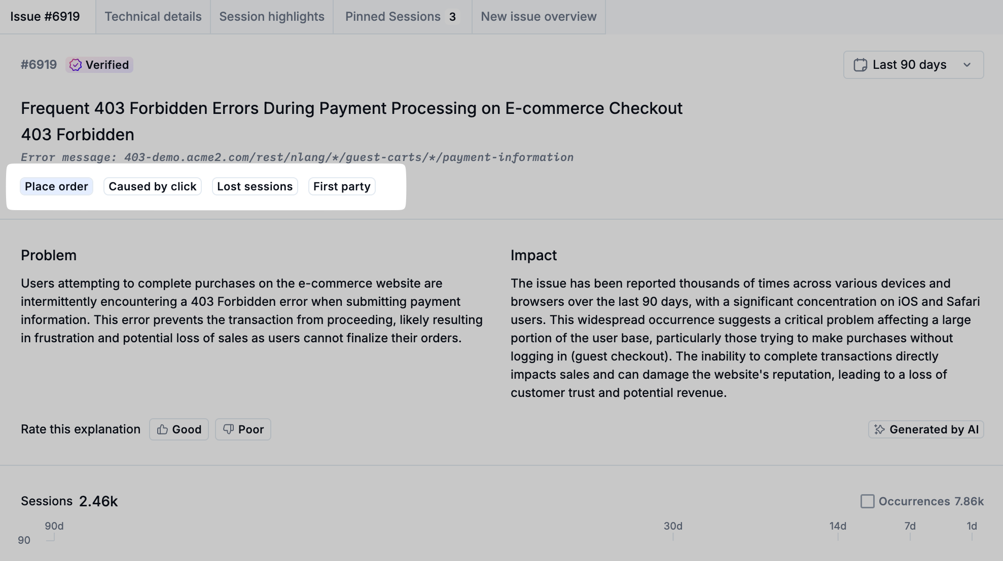 Lost Sessions: an issue has met a threshold of sessions lost within the past 7 days that indicates it is beginning to impact customers.