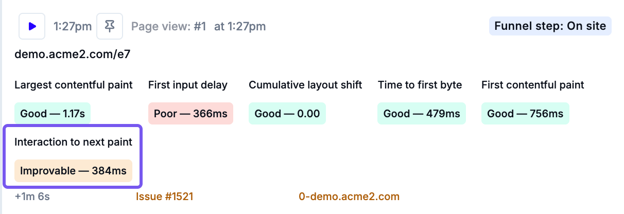 - Examine each Poor or Improvable entry to see the value. This should give you an idea of how much the performance issue is impacting the shopper experience, and how much opportunity you have to optimize the page's performance. Additionally, note what's happening in the session recording when the poor web vital score appears. This can give you insight into what the shopper was doing when the performance issue arose.