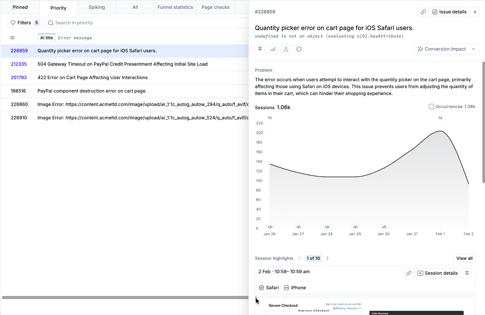Noibu detects errors related to your site's core ecommerce functionality, including the shopping cart, checkout process, product pages, contact forms, and coupons. We also detect secondary errors that impact customer experience, like user experience breaks, broken links, missing images, page loads, and more. Issues represent grouped, recurring errors that shoppers encounter on your site.