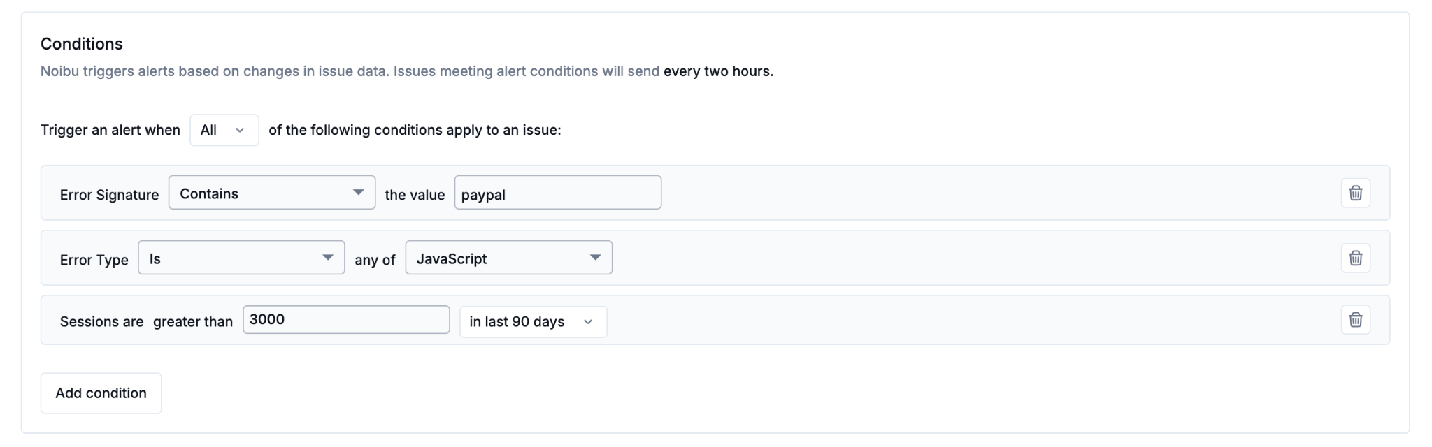 With Alerts, Noibu helps teams move from reactive debugging to proactive monitoring. Custom alerts can notify your team when: new issues appear, errors spike after a release, checkout or payment-related problems occur, and more. Alerts can be delivered via email or Slack, ensuring critical problems are surfaced quickly.