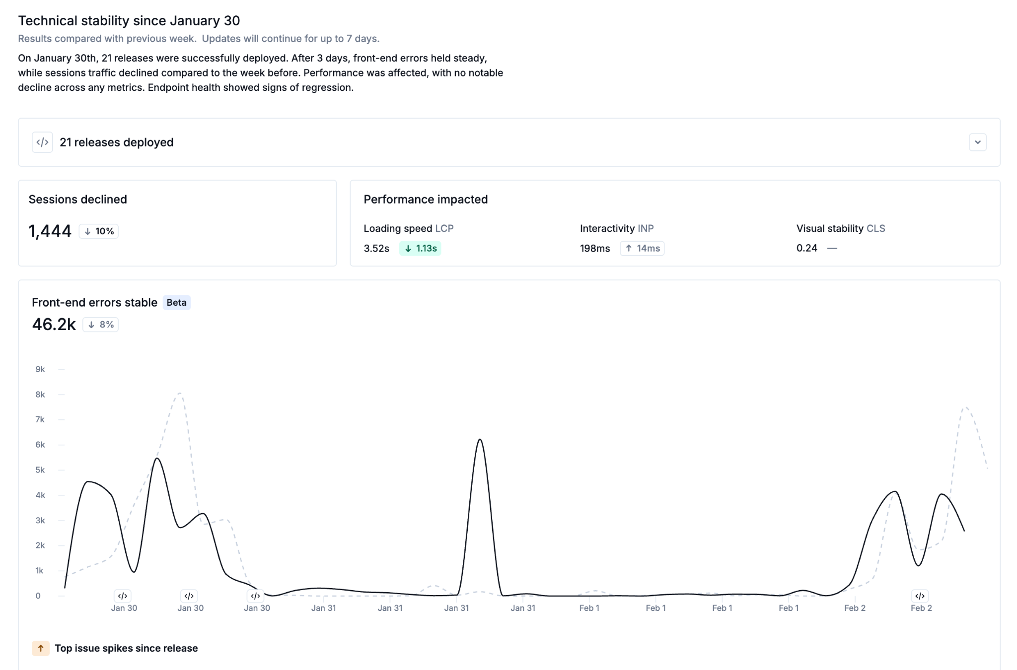 Release Event Reporting helps teams evaluate the impact of code deployments by automatically comparing site behaviour before and after each release. Instead of manually correlating releases with downstream issues, Noibu provides a consolidated view of stability, performance, and error trends tied to every deployment. This makes it easy to validate improvements or identify regressions.