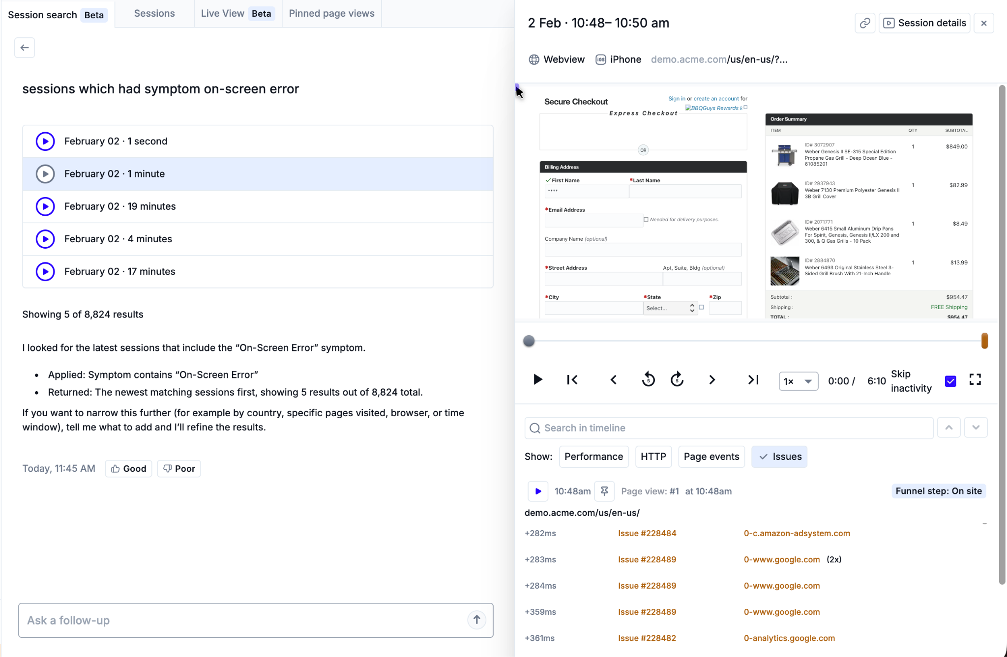 - Captures session replays showing real customer impact