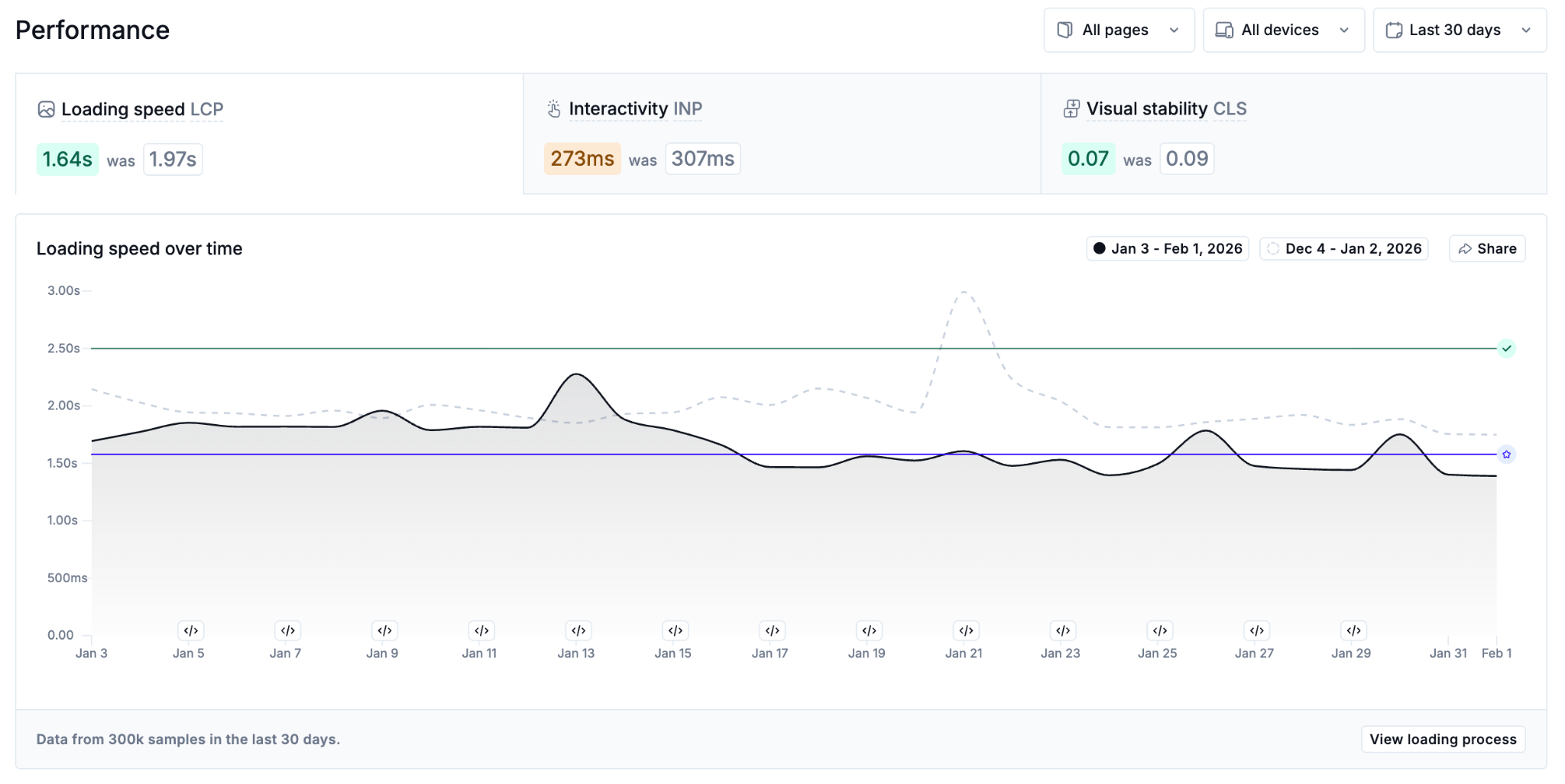 - Monitors Core Web Vitals and performance trends