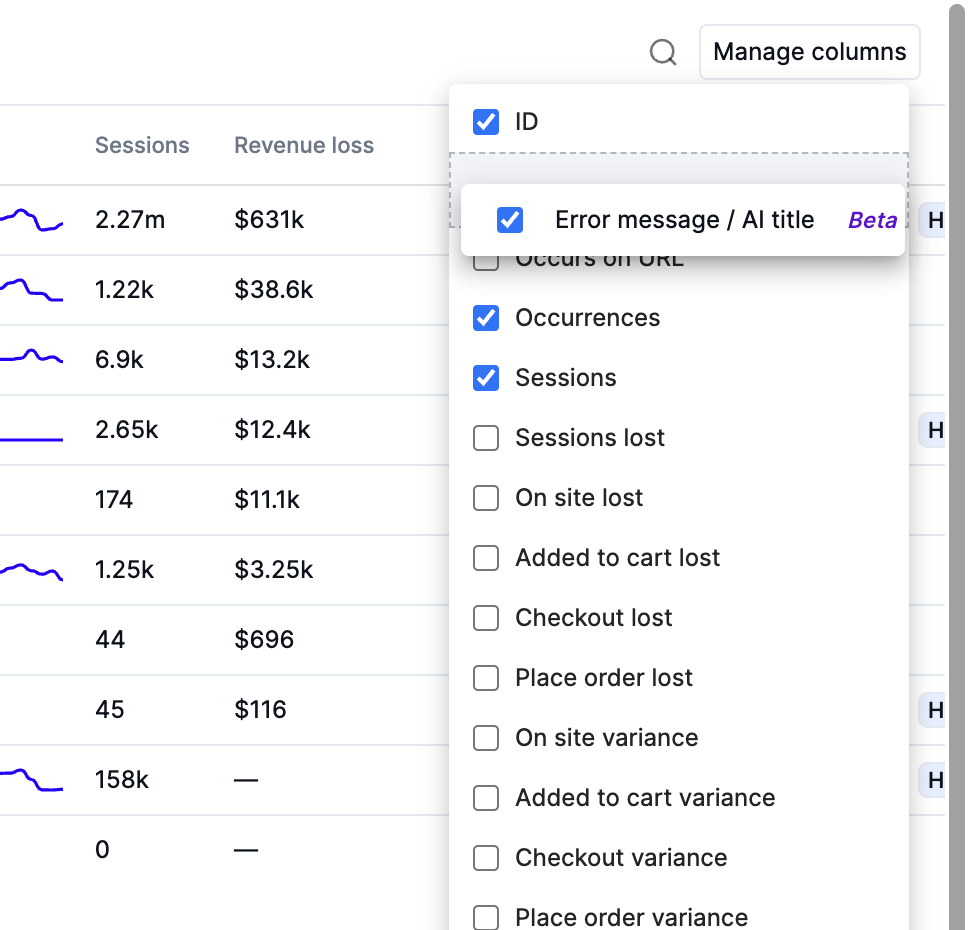 By combining filters and column visibility, order, and sorting, you can easily identify high-impact issues worth investigating. For some suggested combinations of columns and filters, check out these recommended columns and filters configurations.