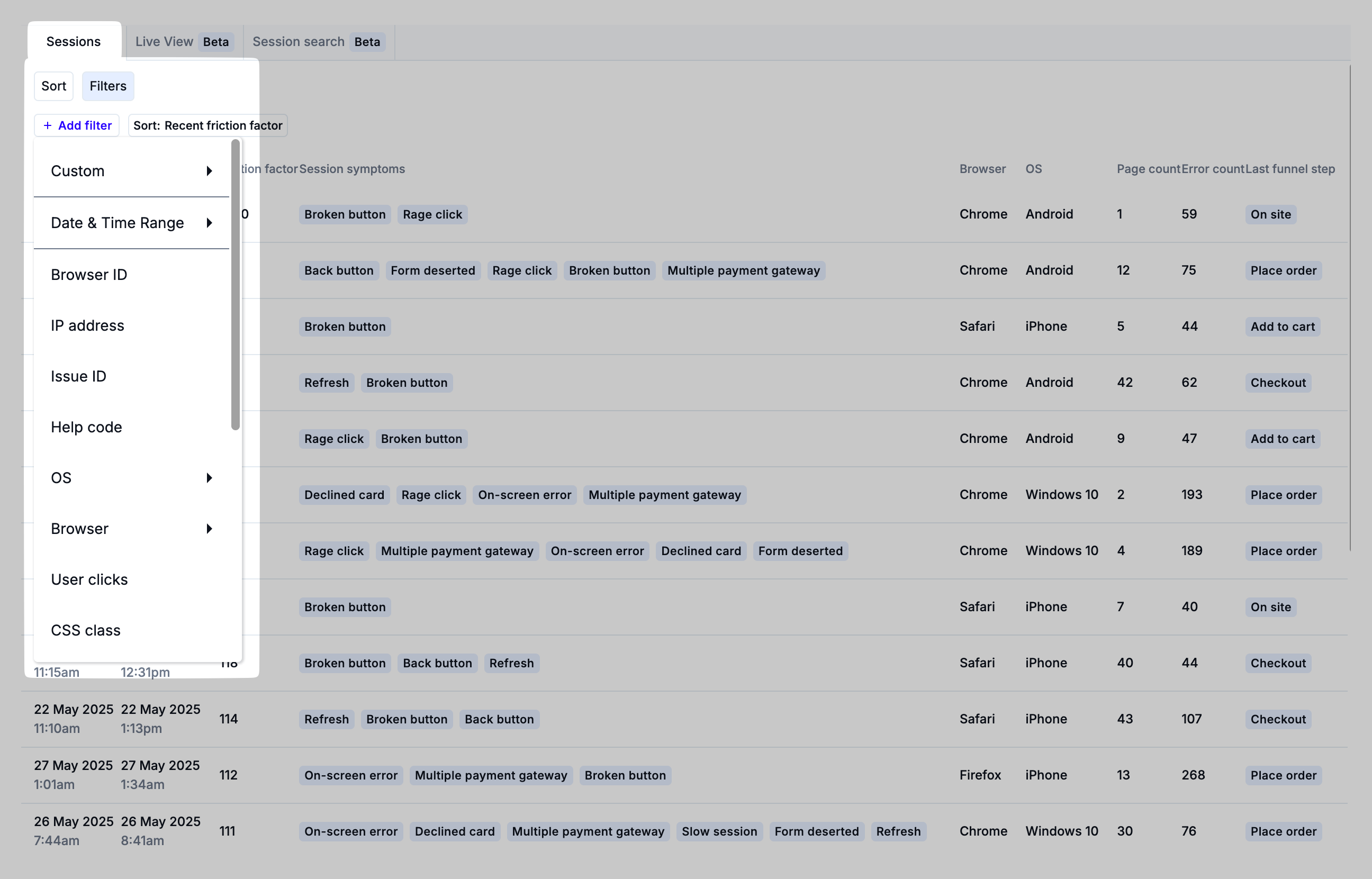 Filtering the list of Sessions can help you find a specific user session or a subset of sessions that demonstrate evidence of friction, frustration, and user-impacting errors. Clicking the Filters toggle will show the Add Filters button.