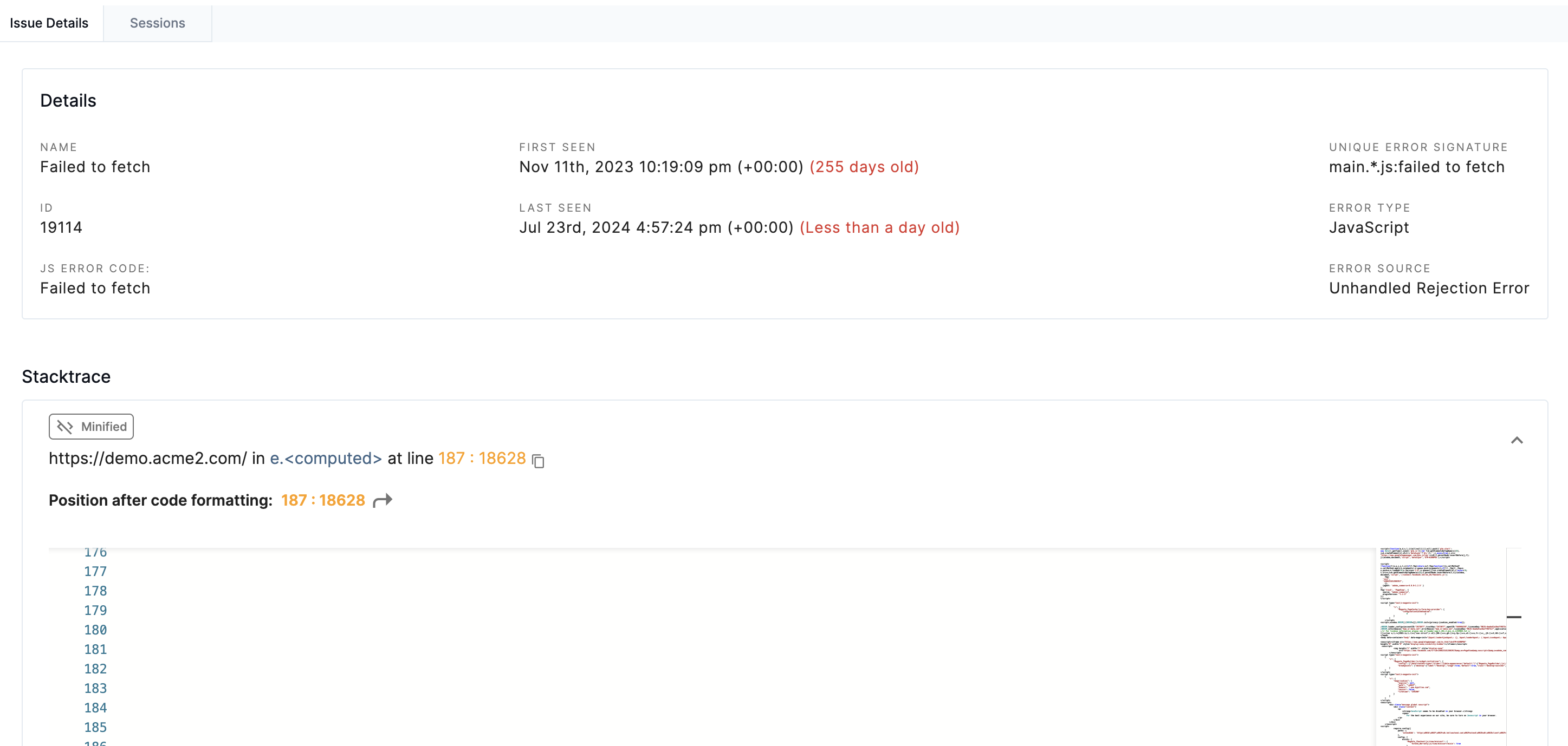 A shareable link provides general details about the issue, as well as a stack trace and any pinned session recordings to help external parties resolve the issue.