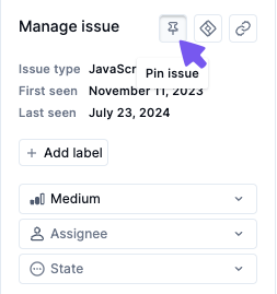 Pinning an impactful issue highlights it for easy reference in the future. Any Pinned issue appears in the Pinned issues tab of the Issues page. You should pin an issue if you find evidence that it's impactful to the shoppers experience to ensure it isn’t lost in the shuffle as you investigate other issues. Click the ‘Pin’ icon to pin an issue.