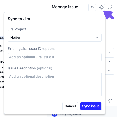 Click the ‘Jira’ icon to sync an issue to Jira. This brings up a modal to enter details about the issue.