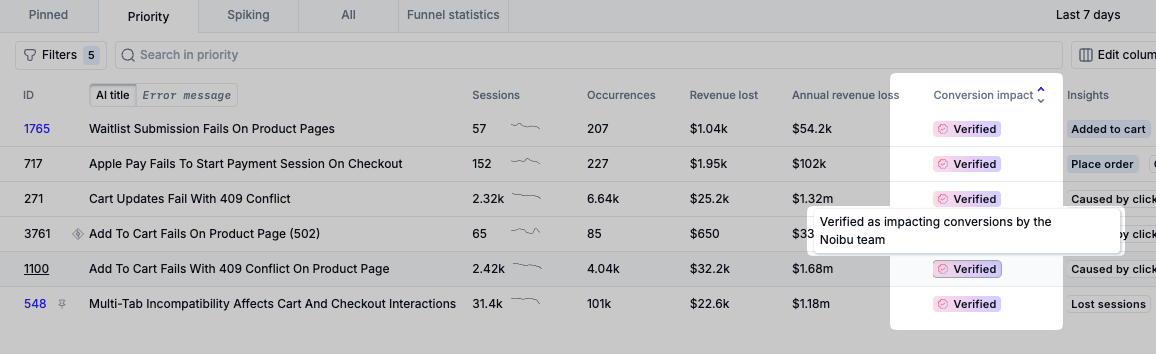 - Verified: Noibu experts have evaluated the AI prediction and validated that the bug is impactful.