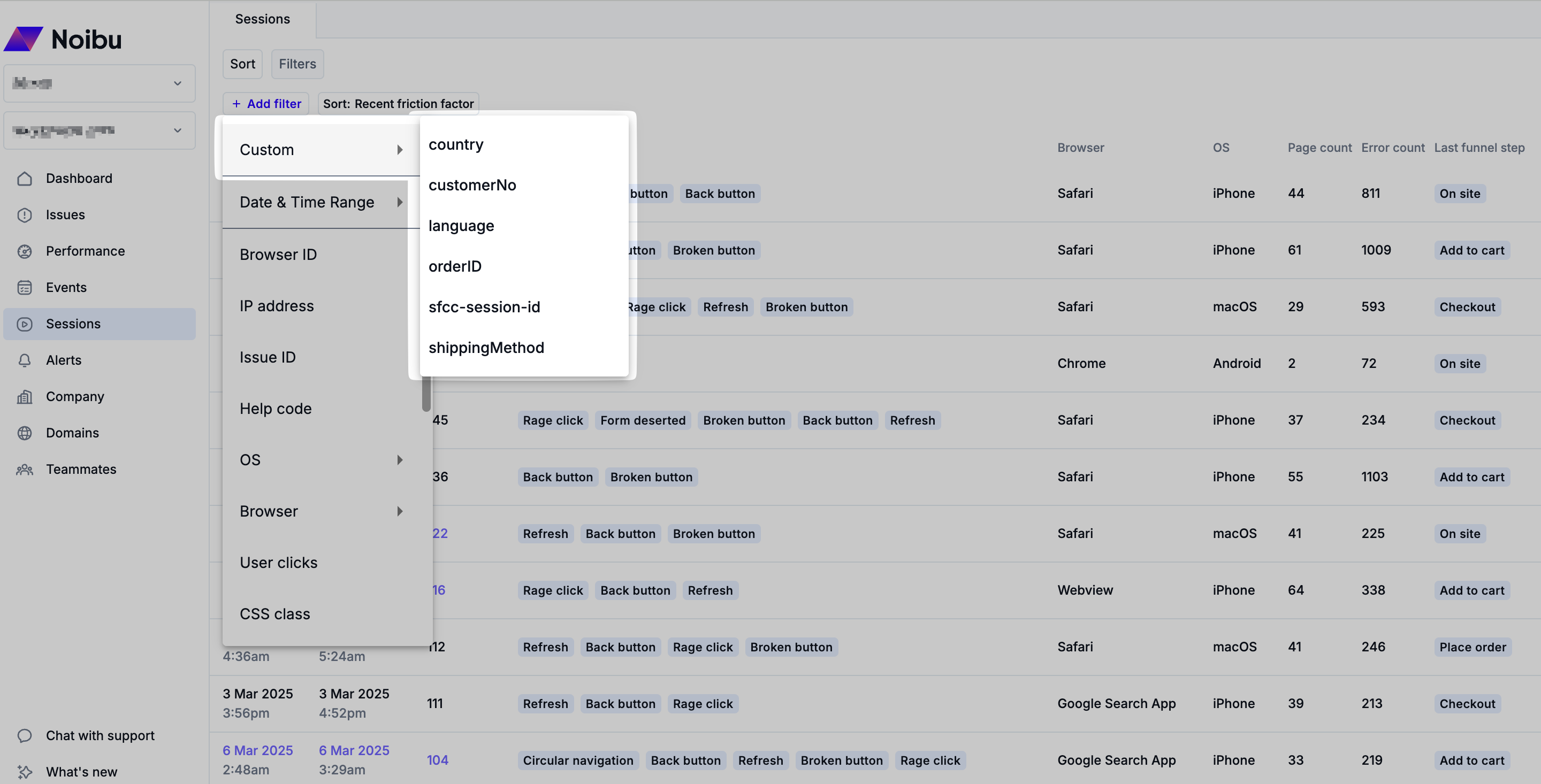 Additional custom attributes can be passed to session recordings via Noibu's SDK, which adds key-value pairs to the current session. These can be later used as search criteria when filtering sessions in the Noibu platform.