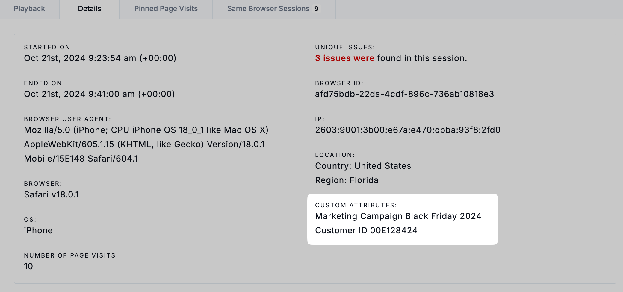 Clicking through to the Session Details page will show additional context on the session, including any relevant custom attributes and their values.