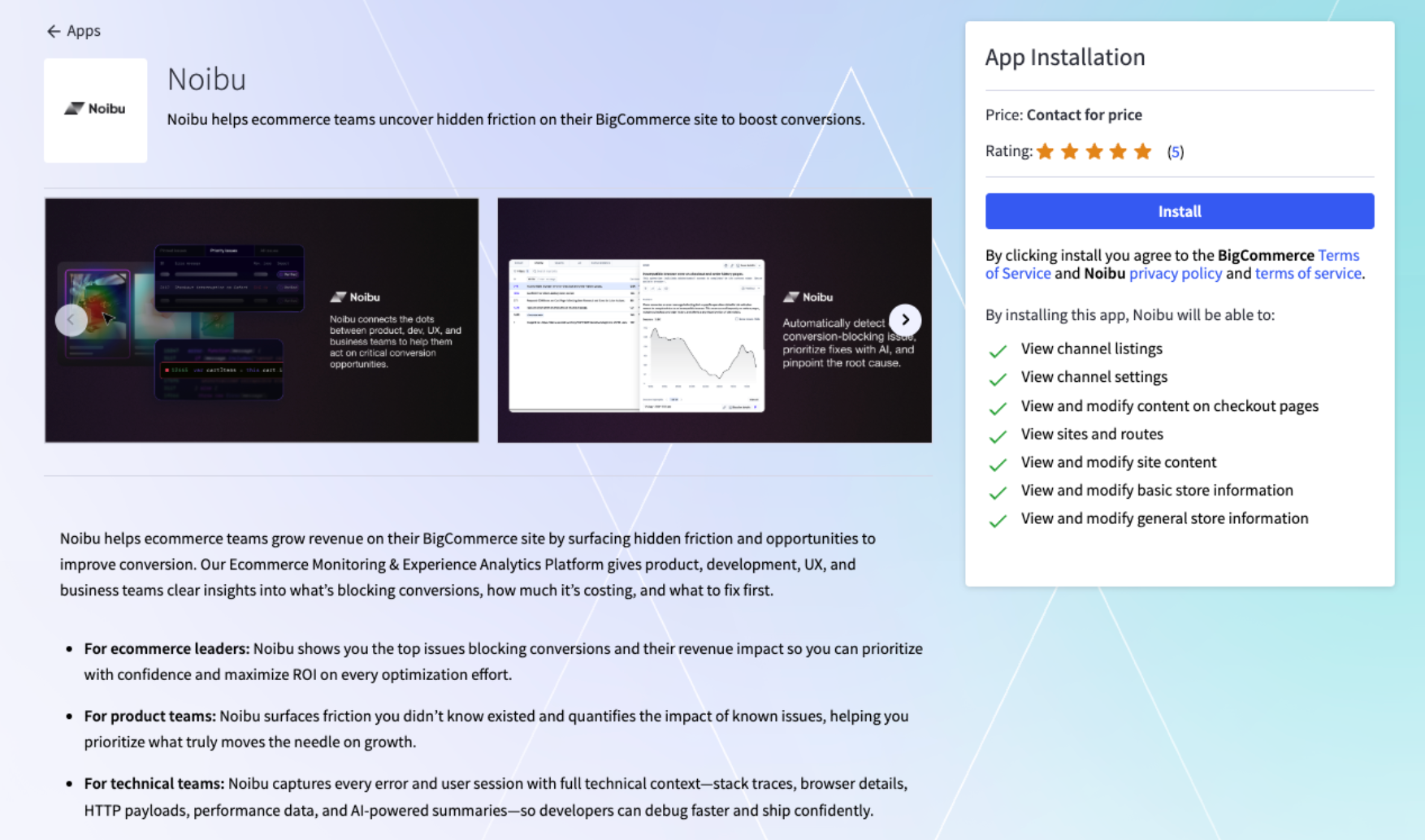 2. Once logged in, you'll be directed to the Noibu app installation page within BigCommerce. Click the 'Install' button and confirm that you wish to install the Noibu app.