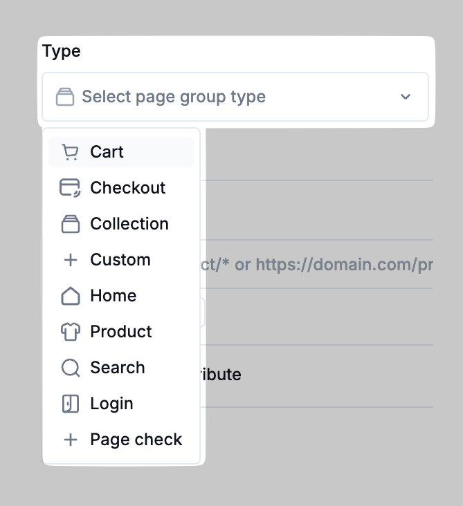 Type: the type of grouping this is. Choose from common ecommerce defaults such as Cart, Checkout, Product, Search, etc., or choose Custom to create your own grouping.