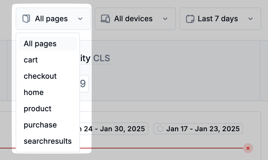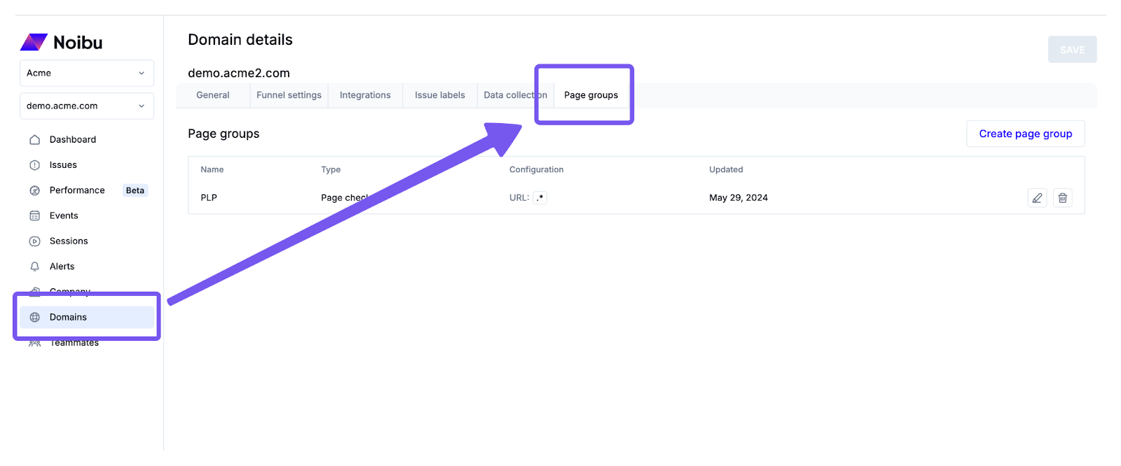 Configuring page groups for your domain allows segmentation of Performance Monitoring and Page Analysis data in Noibu. This can provide valuable insights about performance and engagement on key ecommerce page types like product listing pages (PLPs), checkout, or search results.