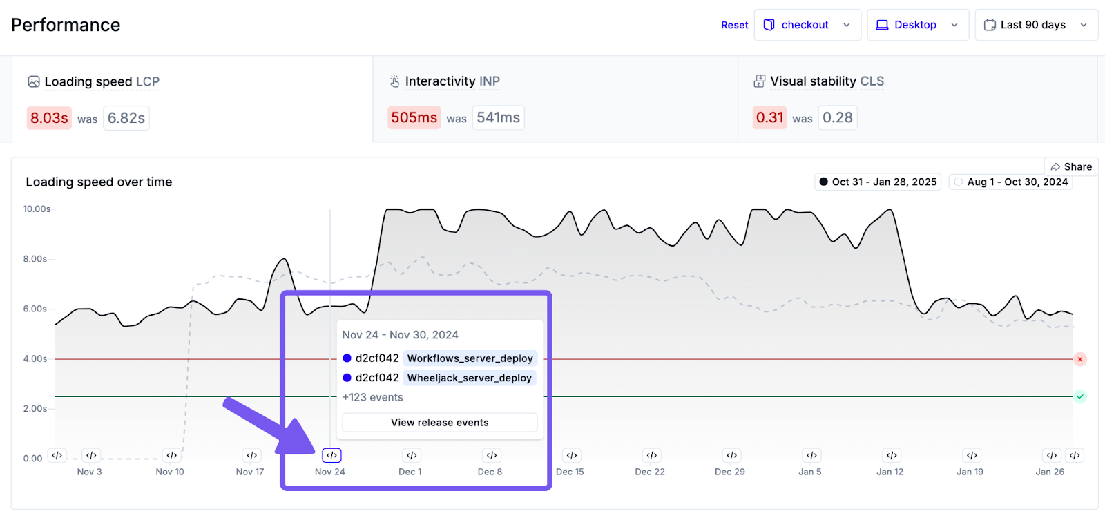If your team uses Noibu’s release monitoring to track issues and performance trends following a release, you may also be able to correlate a recent deployment to a change in performance.