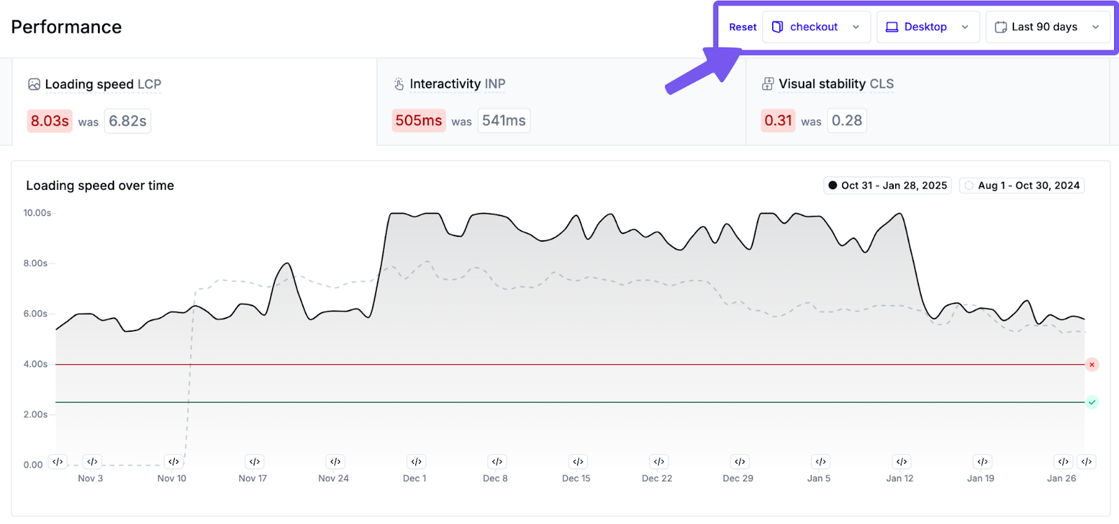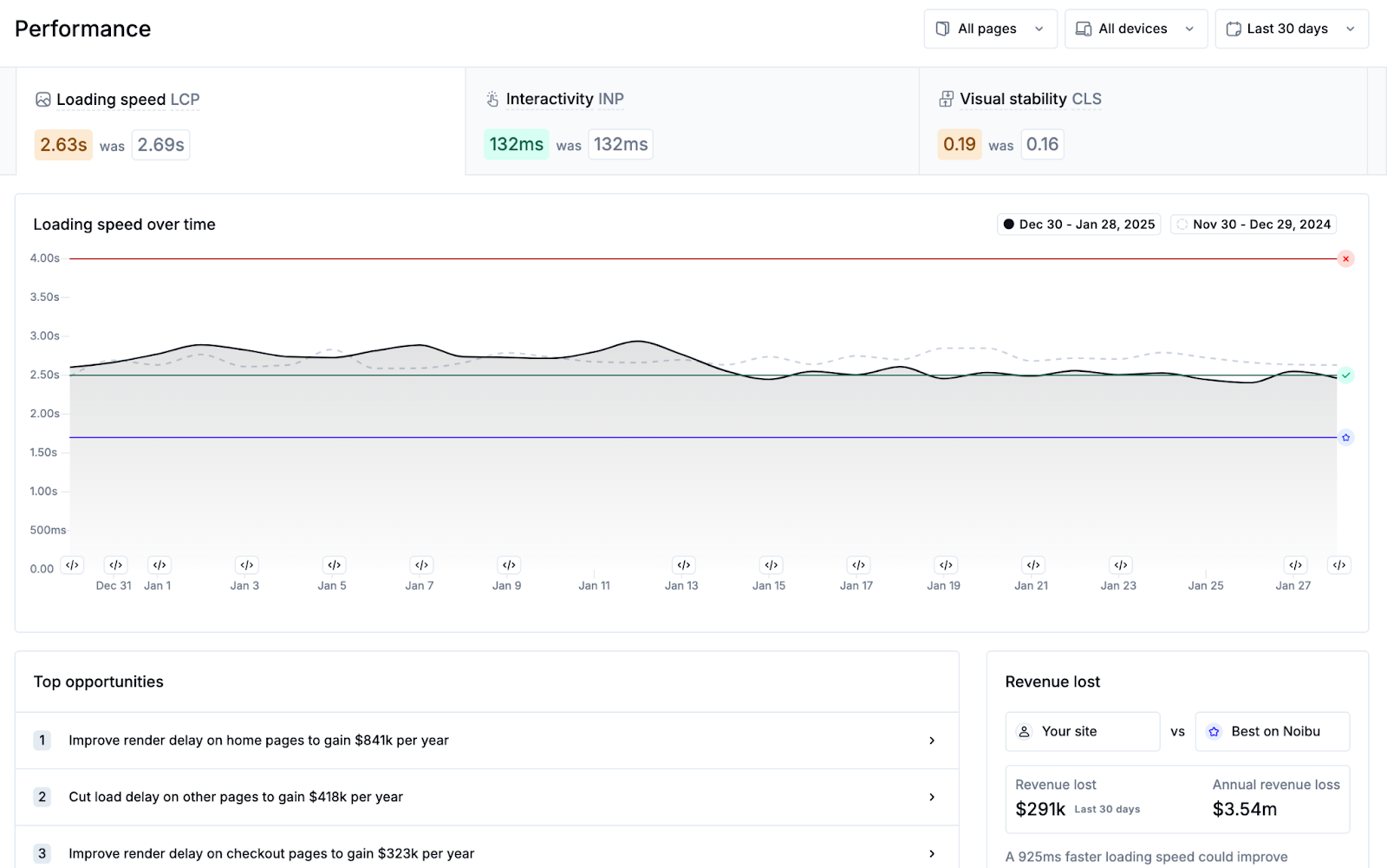 As a general best practice, it’s recommended to check performance metrics at least once per month to keep tabs on your site, and even more frequently when actively making changes to address performance issues. Performance monitoring data in Noibu is refreshed daily.