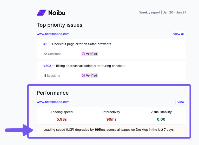 When applicable, specific performance insights are also presented in Noibu, as well as via email. These proactively identify performance degradations for specific page groups and/or device types.