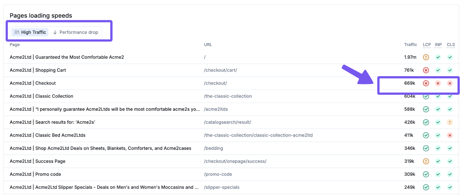 At the bottom of each of the loading speed (LCP), interactivity (INP), and visual stability (CLS) tabs is a list of the highest-traffic pages and those that have recently degraded in performance. Examining this table can identify specific pages that may need investigation.