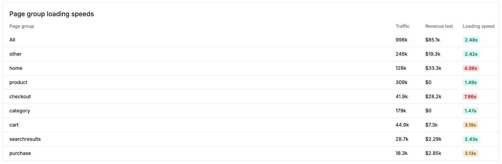 For the LCP metric specifically, investigate the Top Opportunities and Page Group Loading Speeds sections for an overview of the loading speed of each page group (e.g. product pages, homepage, collection pages). This table can help identify specific groups of pages that need investigation. Learn more about page groups.