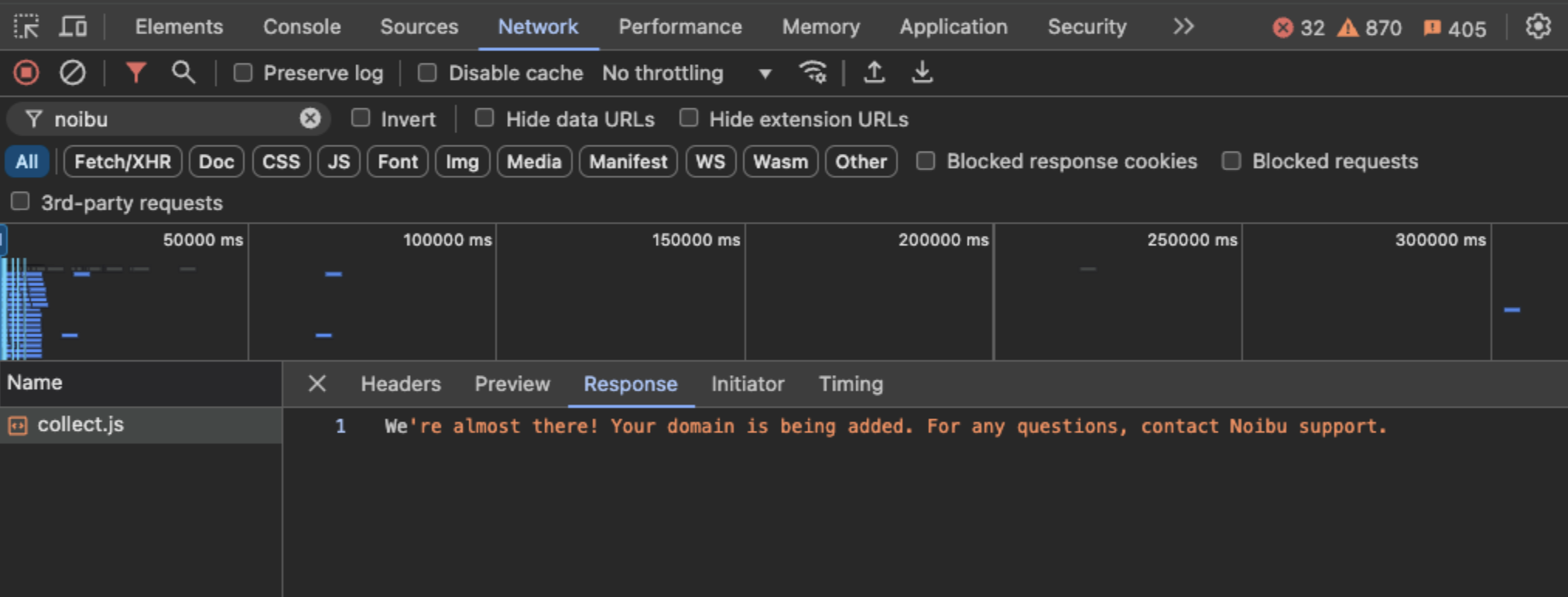 After you've deployed the script to your site, Noibu's technical team will finish configuring your domain. During this time, you'll see the following script response: We're almost there! Your domain is being added. For any questions, contact Noibu support.