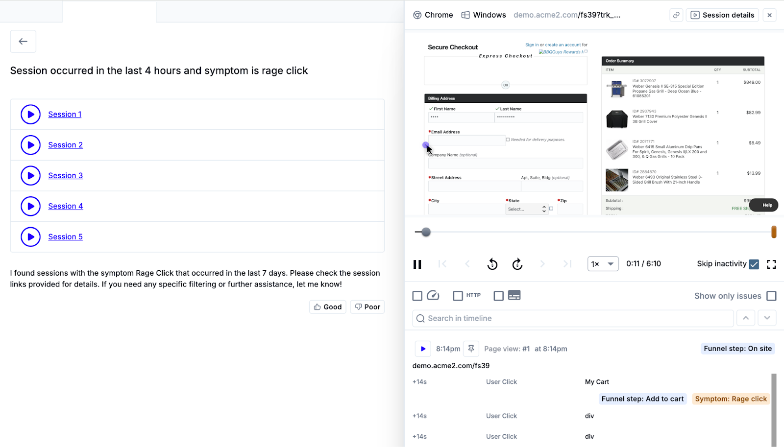 For example, “Only sessions on the checkout stage” could narrow the list of sessions to only those that involved the checkout funnel stage. This ability to change and refine your query helps zero in on high-priority user experience issues more efficiently.