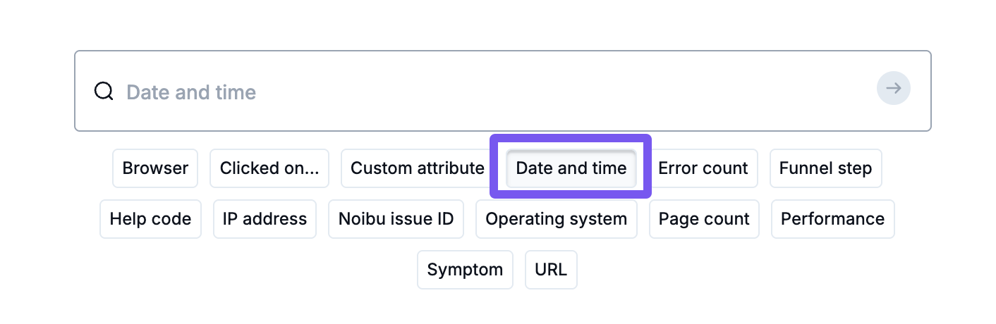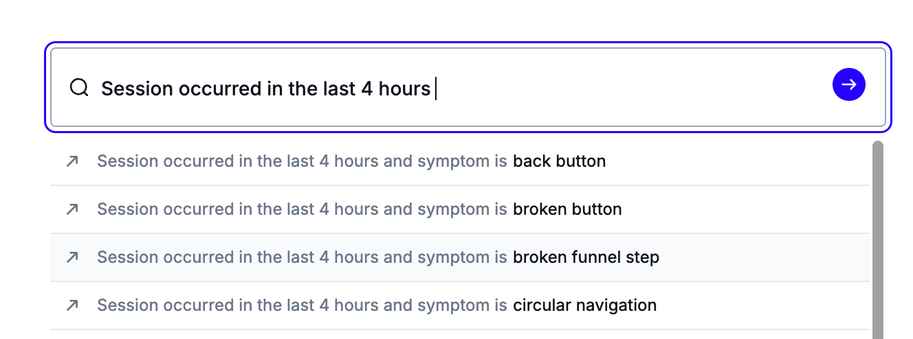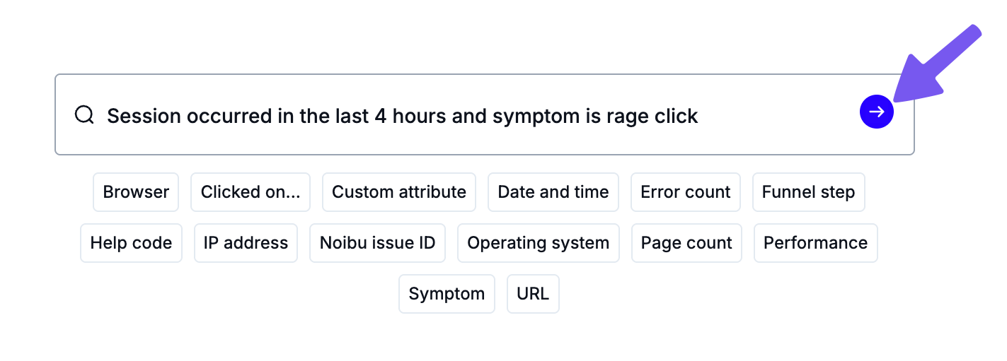 Combine multiple pills, or type in the search box to refine your search query. For example, selecting "Occurred In the last 4 hours" and "Symptom Is Rage Click" will find sessions that occurred within the last 4 hours and involved rage clicks.