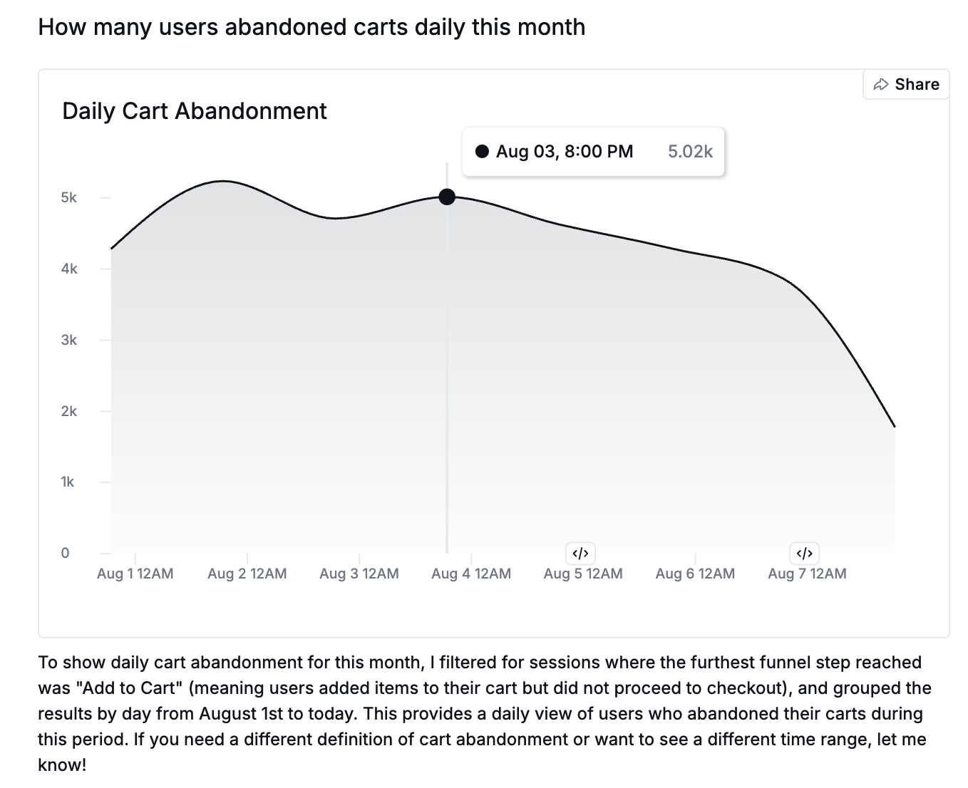 Noibu's AI can also analyze and graph session data from the past 30 days, helping you spot trends and patterns quickly. You can ask for a time-series view to see counts over days, weeks, or months, or request a bar chart to compare top categories.