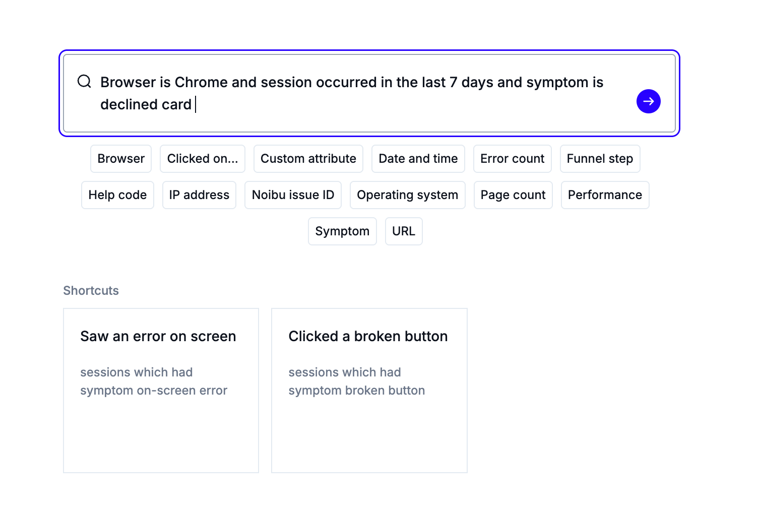 AI Session Search makes it easy to find specific session replays in Noibu using natural language queries with a guided filter interface. It streamlines the way teams discover replays of user sessions to gain more context on errors and user-reported problems.