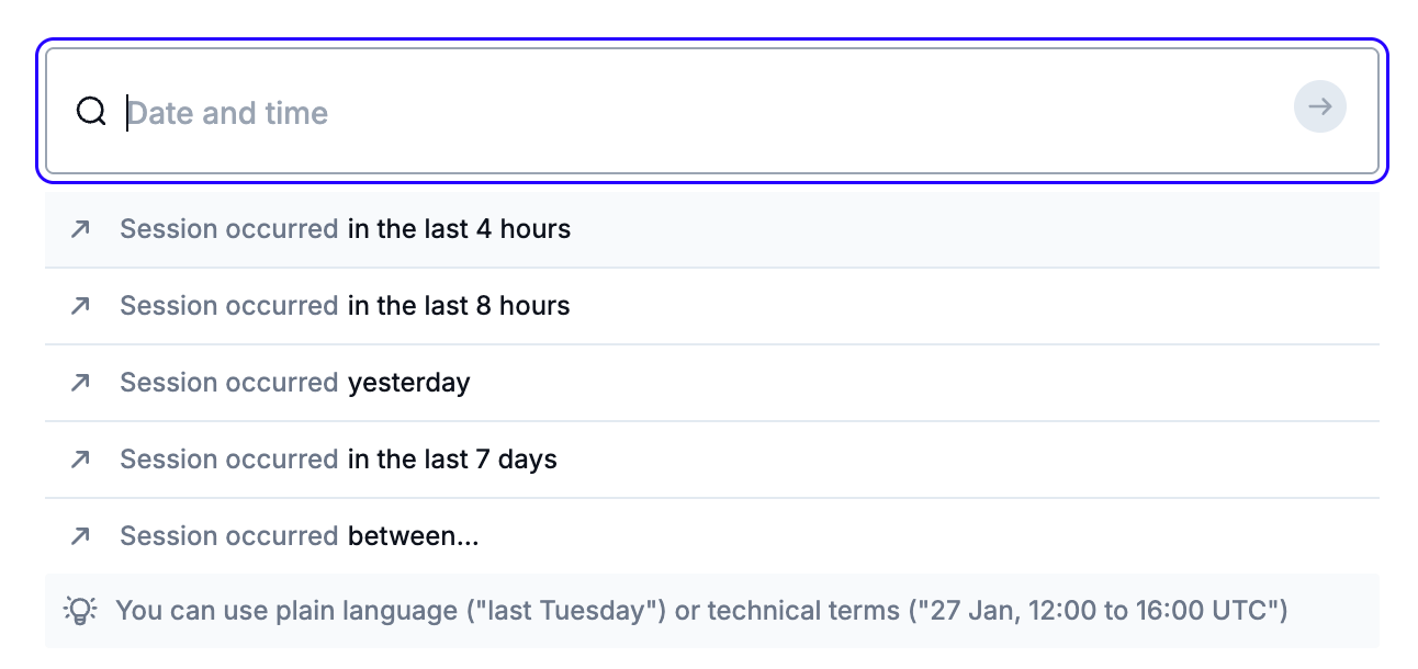 You can build a search query by typing in the search bar using natural language (e.g., “sessions from yesterday with rage clicks”), or clicking on filter pills below the search bar.