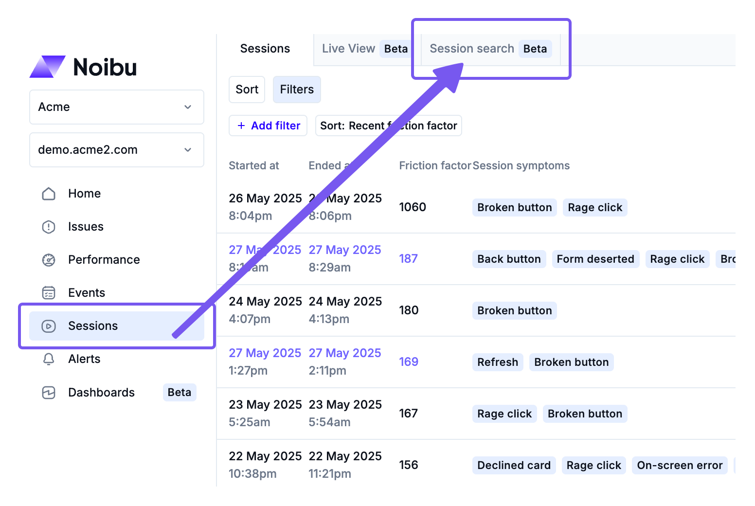 From the Sessions page in Noibu, click the Session search (Beta) tab to explore the AI search capabilities.