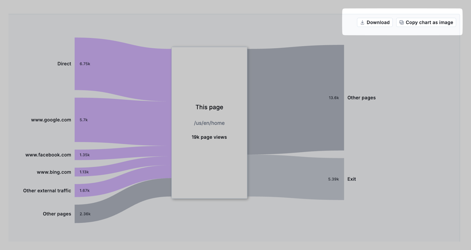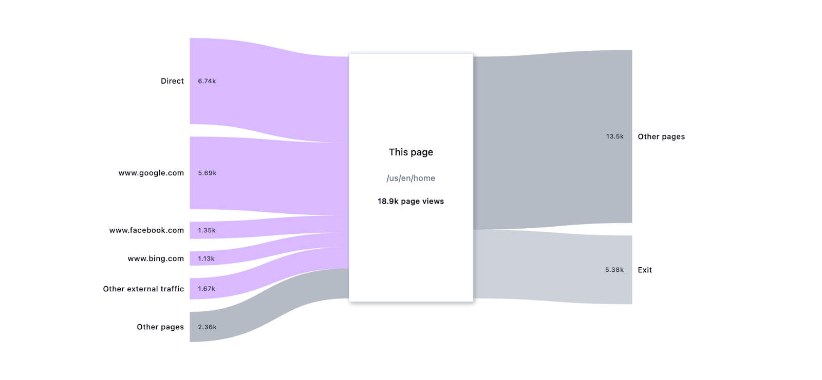 - Inbound traffic: Represents how users arrived at the selected page, including direct traffic, external sources, and navigation from other pages.