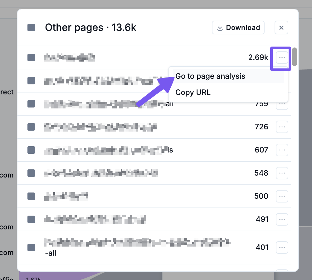 Additionally, for inbound and outbound traffic groups, you can click the … beside the traffic count to copy the URL of a specific page within the group, or to view the Journeys tab for the selected page.