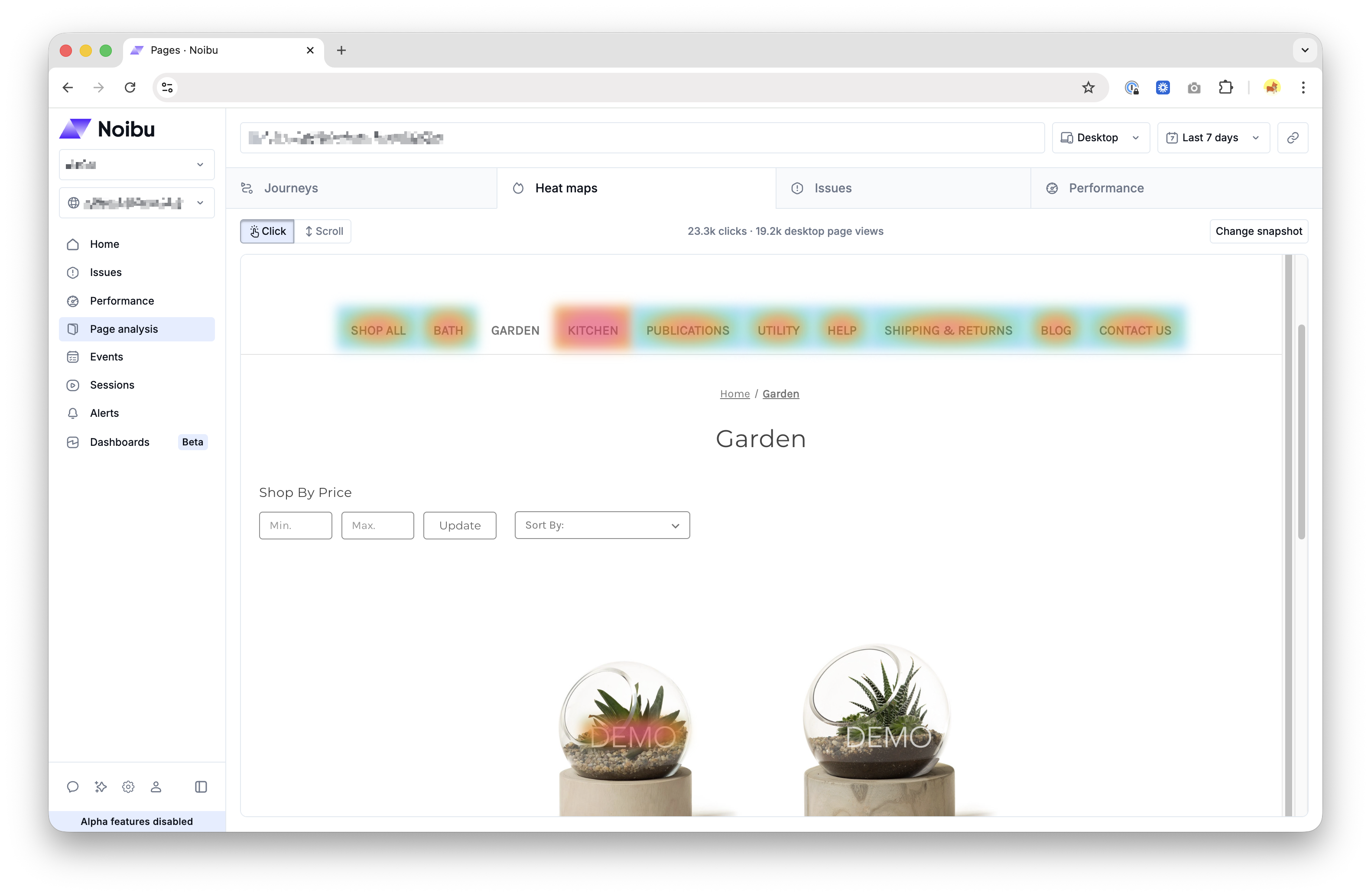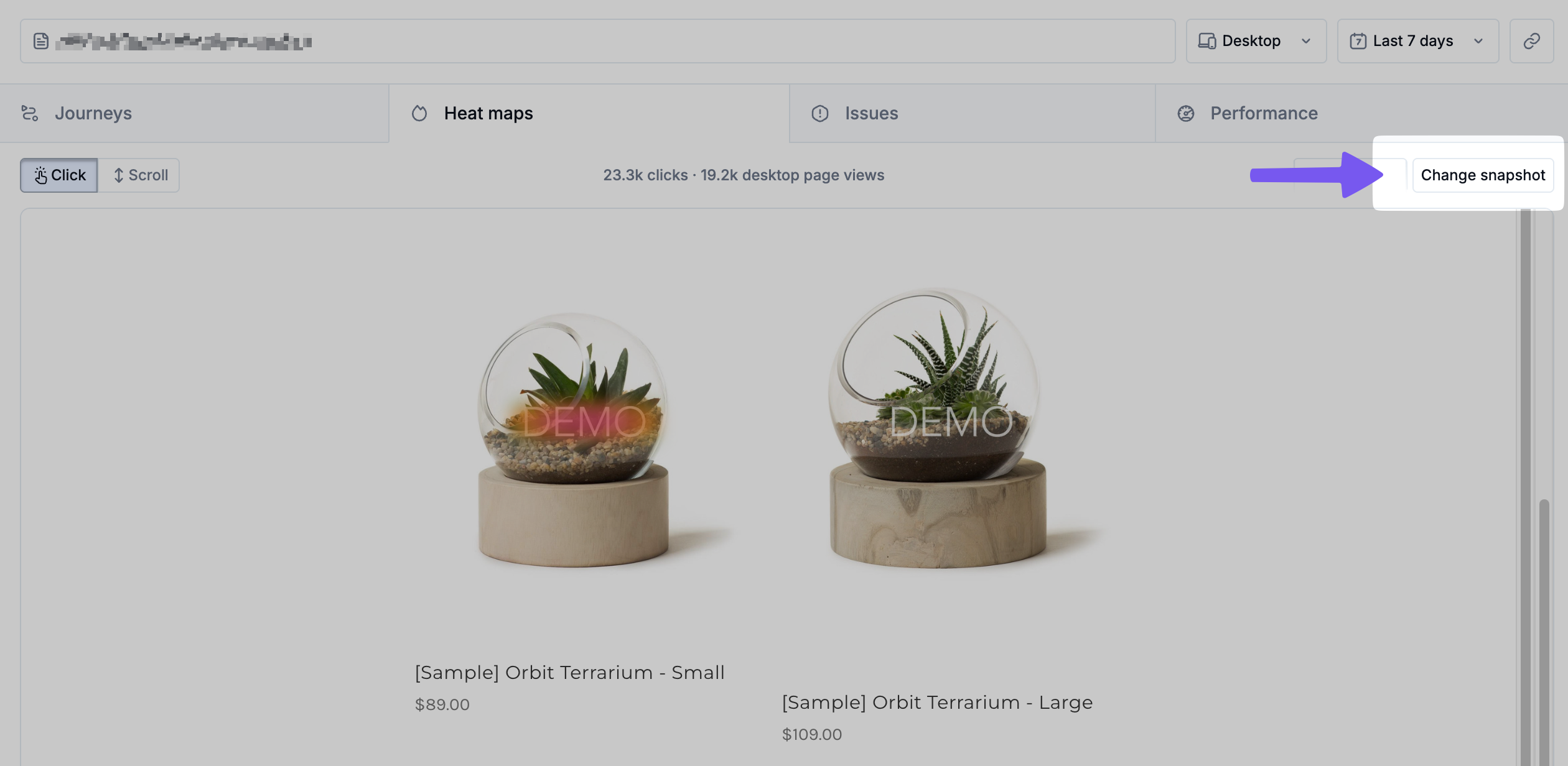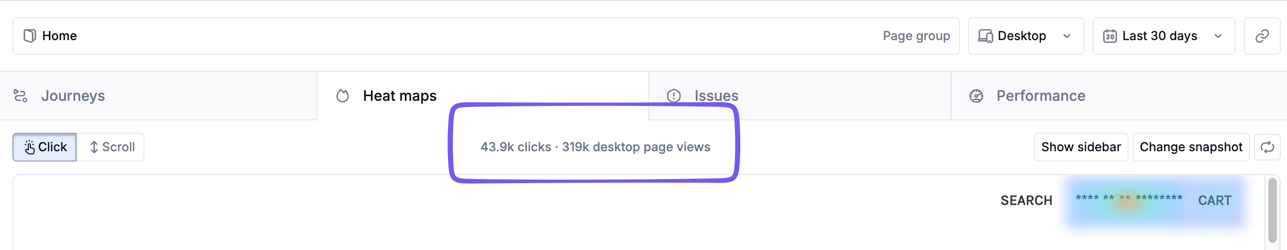 Unlike other analytics tools that use synthetic or placeholder layouts, Noibu’s heat map visualizations are based on reconstructed snapshots, derived directly from a representative user session within the selected timeframe.
