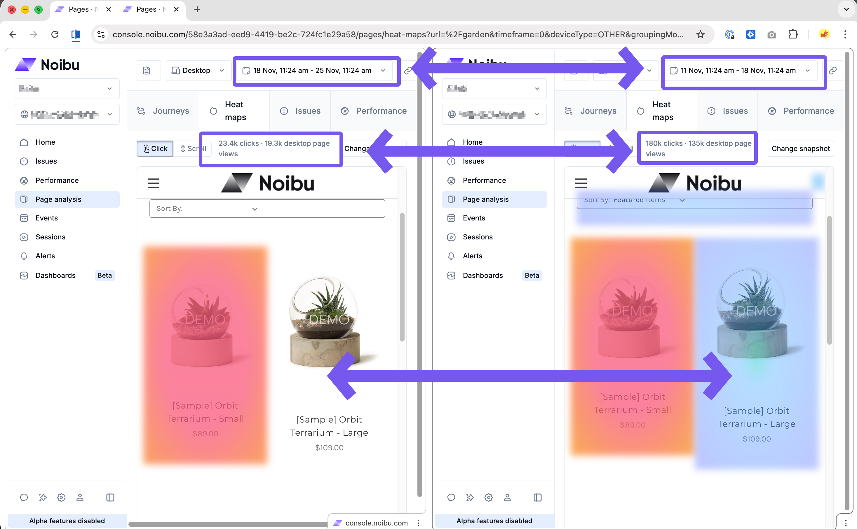 For example, comparing click maps across different date ranges can help you understand if the total number of interactions scaled with traffic, and whether click distribution patterns shifted. Similarly, differences in scroll depth across different date ranges may help uncover layout issues or content fatigue.