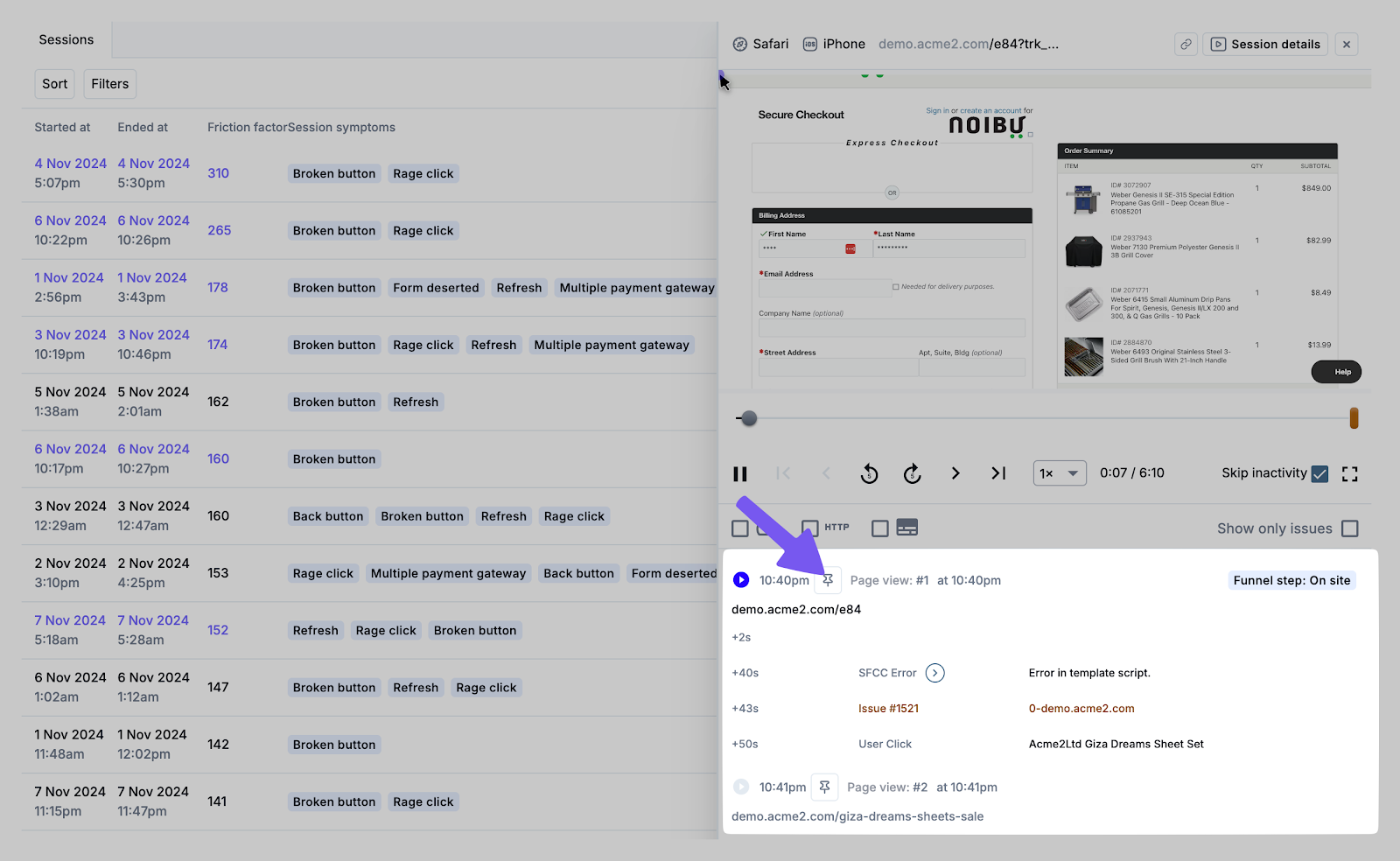 Reviewing session replays is a useful way to understand how users experience issues on your site. Each user session consists of multiple page views, and pinning a page view lets you bookmark meaningful evidence of user impact from a session, such as friction or a related front-end issue, so it can be referenced later.
