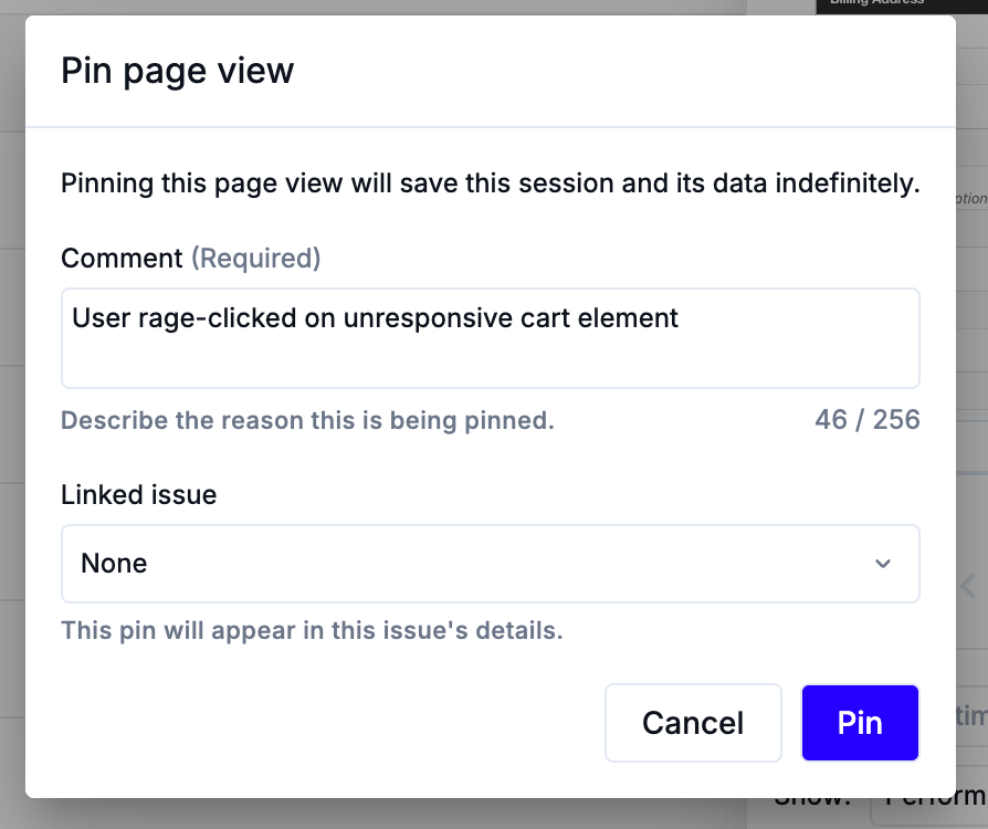You will be prompted to add a comment describing why this session looks important before pinning the session. Use clear, specific comments so teammates can understand why a session was pinned without rewatching the entire replay.