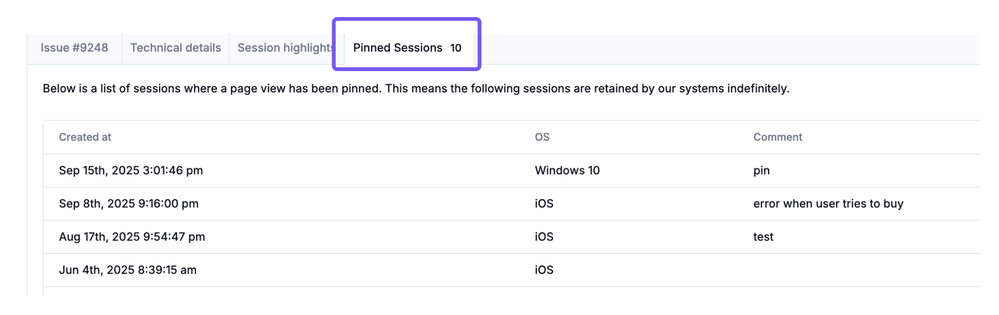 Available from the Sessions page, this tab shows all pinned items across your organization. It provides details such as who pinned it, when it was pinned, session start/end times, and any linked issue.
