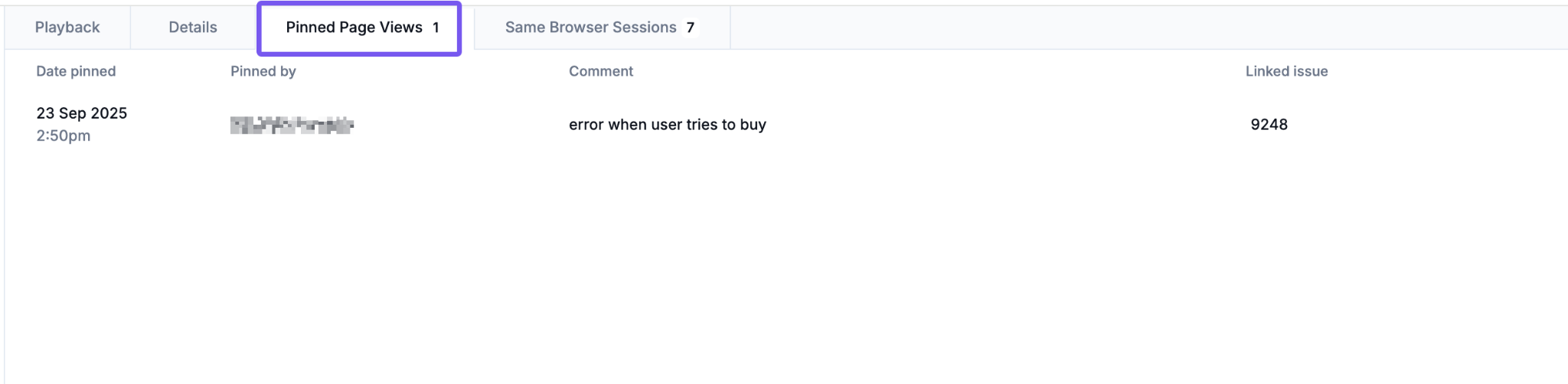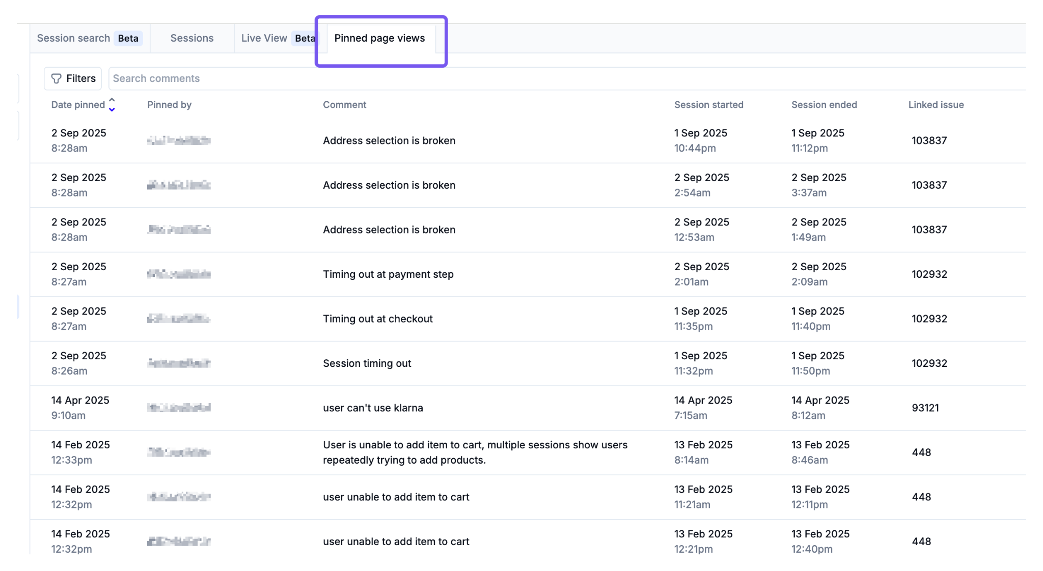 Available from the Session Details page of an individual session, this tab shows all pinned page views for a specific session. It provides details such as who pinned it, when it was pinned, session start/end times, and any linked issue.