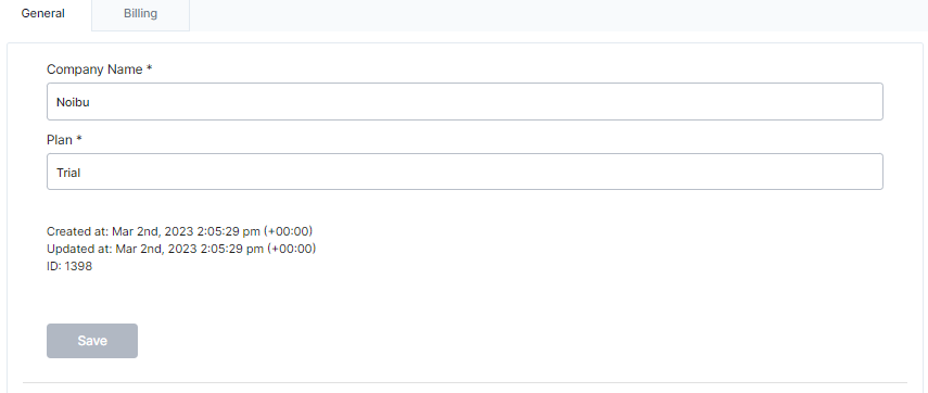 The Company module is a hub for your company's high-level information, including billing details. Opening the Company module brings you to the General tab, where your company's name and plan are locked in. Here, you can also indicate whether or not your Noibu instance requires OAuth2 Authentication.
