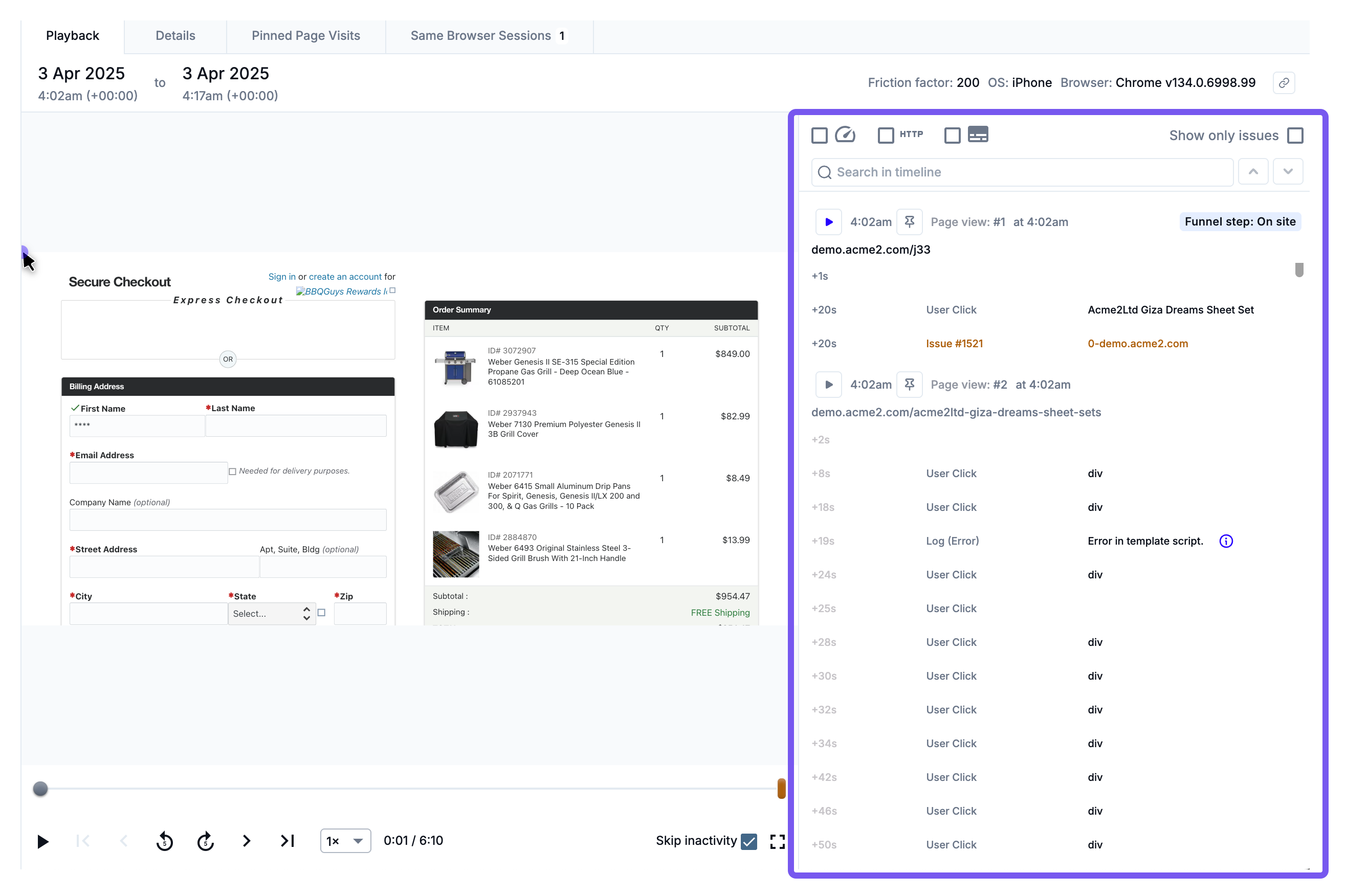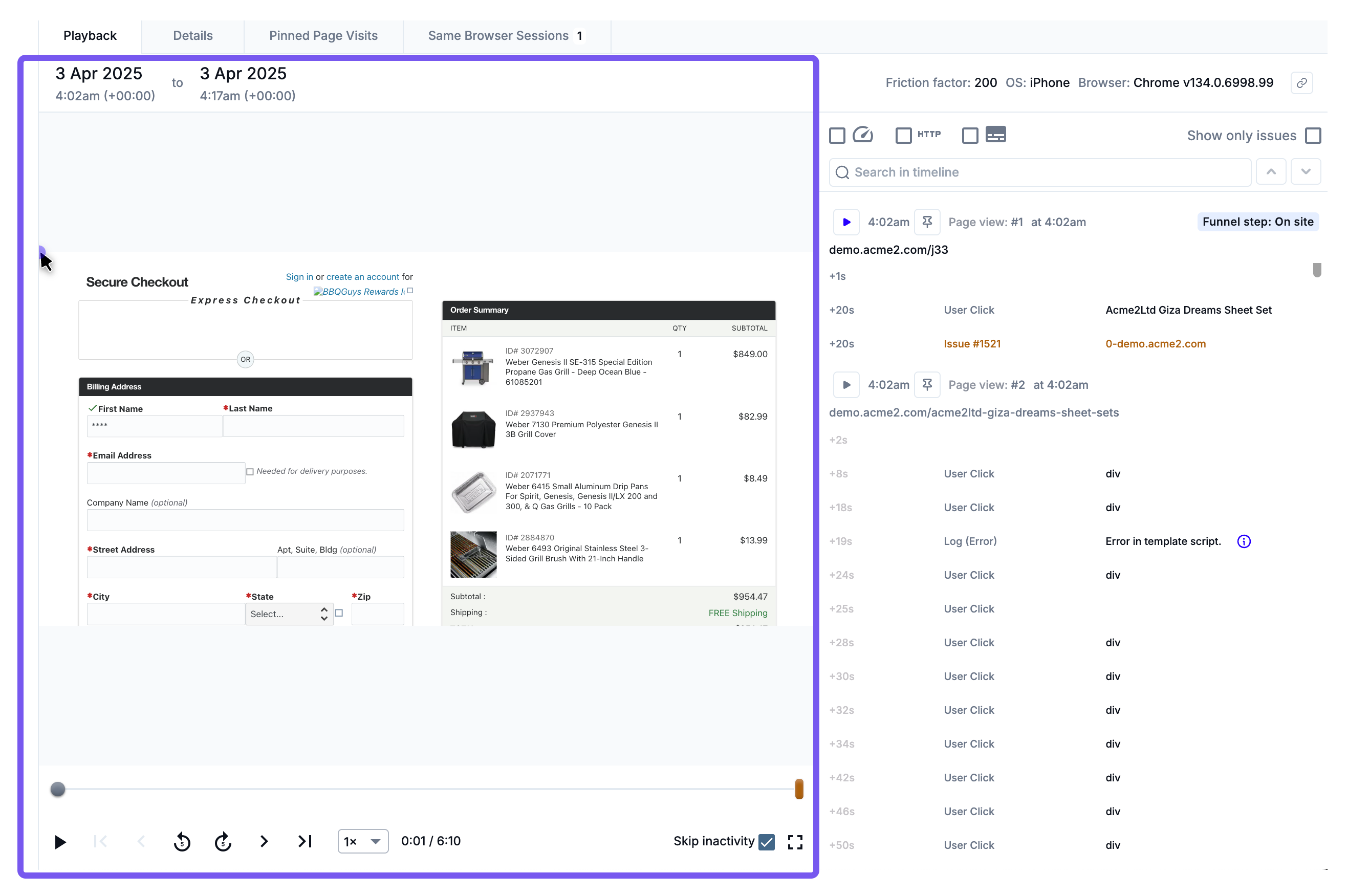 Through the Session Player, you can watch a customer's session and see where errors impacted their journey. Session videos block out user-identifying information, but you can track the customer's progress by following the mouse movements on screen. You can speed up the playback to 2x, 4x, or 8x. You can also slow the playback down to ½X or ¼X.
